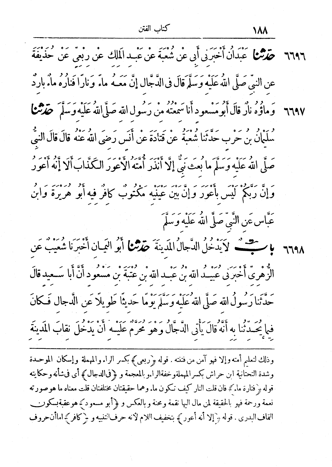 6696 - حَدَّثَنَا عَبْدَانُ أَخْبَرَنِي أَبِي عَنْ شُعْبَةَ عَنْ عَبْدِ الْمَلِكِ عَنْ رِبْعِيٍّ عَنْ حُذَيْفَةَ عَنْ النَّبِيِّ صَلَّى اللَّهُ عَلَيْهِ وَسَلَّمَ قَالَ فِي الدَّجَّالِ إِنَّ مَعَهُ مَاءً وَنَارًا فَنَارُهُ مَاءٌ بَارِدٌ وَمَاؤُهُ نَارٌ قَالَ أَبُو مَسْعُودٍ أَنَا سَمِعْتُهُ مِنْ رَسُولِ اللَّهِ صَلَّى اللَّهُ عَلَيْهِ وَسَلَّمَ