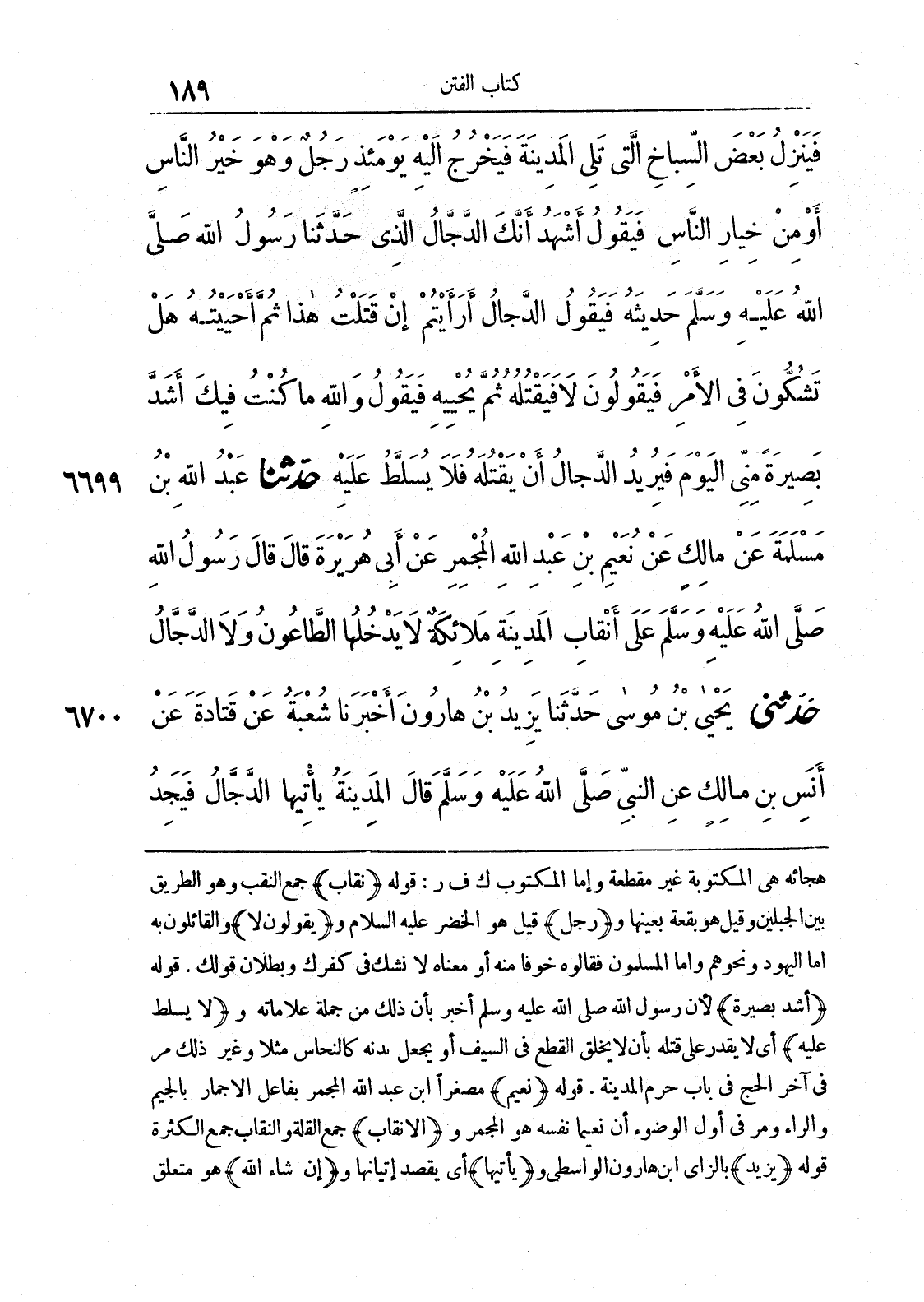 هجائه هي المكتوبة غير مقطعة وإما المكتوب ك ف ز: قوله (نقاب) جمع النقب وهو الطريق بين الجبلين وقيل هو بقعة بعينها و (رجل) قيل هو الخضر عليه السلام و (يقولون لا) والقائلون ب هاما اليهود ونحوهم وإما المسلمون فقالوه خوفا منه أو معناه لا نشك في كفرك وبطلان قولك, قوله (أشد بصيرة) لان رسول الله صلى الله عليه وسلم أخبر بان ذلك من جملة علاماته و (لا يسلط عليه) أي لا يقدر على قتله بان لا يخلق القطع في السيف أو يجعل بدنه كالنحاس مثلا وغير ذلك مر في آخر الحج في باب حرم المدينة, قوله (نعيم) مصغرا ابن عبد الله المجمر بفاعل الإجمار بالجيم والراء ومر في أول الوضوء أن نعيما نفسه هو المجمر و (الانقاب) جمع القلة والنقاب جمع الكثرة قوله (يزيد) بالزاي ابن هارون الواسطي و (يأتيها) أي يقصد إتيانها و (إن شاء الله) هو متعلق