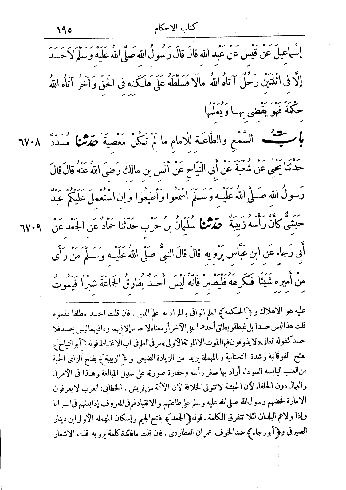 عليه هو الإهلاك و (الحكمة) العلم الوافي والمراد به علم الدين، فإن قلت الحسد مطلقا مذموم قلت هذا ليس حسدا بل غبطة ويطلق أحدهما على الآخر أو معناه لا حسد إلا فيهما وما فيهما ليس بحسد فلا حسد كقوله تعالى «لا يذوقون فيها الموت إلا الموتة الأولى» مر في العلم في باب الاغتباط قوله (أبو التياح) بفتح الفوقانية وشدة التحتانية وبالمهملة يزيد من الزيادة الضبعي و (الزبيبة) بفتح الزاي الحبة من العنب اليابسة السوداء أراد بها صغر رأسه وحقارة صورته على سبيل المبالغة وهذا في الأمراء والعمال دون الخلفاء لأن الحبشة لا تتولى الخلافة الأئمة من قريش. الخطابي: العرب لا يعرفون الإمارة فحضهم رسول الله صلى الله عليه وسلم على طاعتهم والانقياد لهم في المعروف إذا بعثهم في السرايا واذا ولاهم البلدان لئلا تتفرق الكلمة. قوله (الجعد) بفتح الجيم وإسكان المهملة الأولى ابن دينار الصيرفي و (أبو رجاء) ضد الخوف عمران العطاردي. فان قلت ما فائدة كلمة يرويه قلت الإشعار