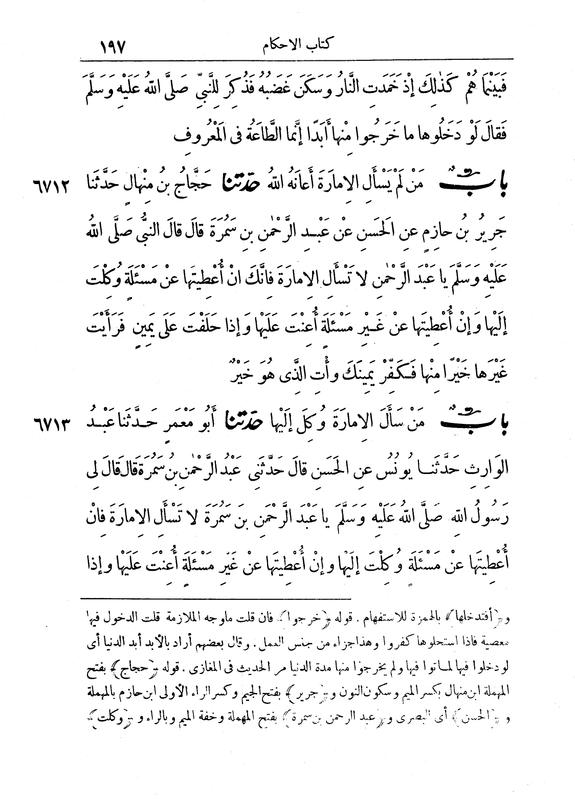 6713 - حَدَّثَنَا أَبُو مَعْمَرٍ حَدَّثَنَا عَبْدُ الْوَارِثِ حَدَّثَنَا يُونُسُ عَنْ الْحَسَنِ قَالَ حَدَّثَنِي عَبْدُ الرَّحْمَنِ بْنُ سَمُرَةَ قَالَ قَالَ لِي رَسُولُ اللَّهِ صَلَّى اللَّهُ عَلَيْهِ وَسَلَّمَ يَا عَبْدَ الرَّحْمَنِ بْنَ سَمُرَةَ لَا تَسْأَلْ الْإِمَارَةَ فَإِنْ أُعْطِيتَهَا عَنْ مَسْأَلَةٍ وُكِلْتَ إِلَيْهَا وَإِنْ أُعْطِيتَهَا عَنْ غَيْرِ مَسْأَلَةٍ أُعِنْتَ عَلَيْهَا وَإِذَا