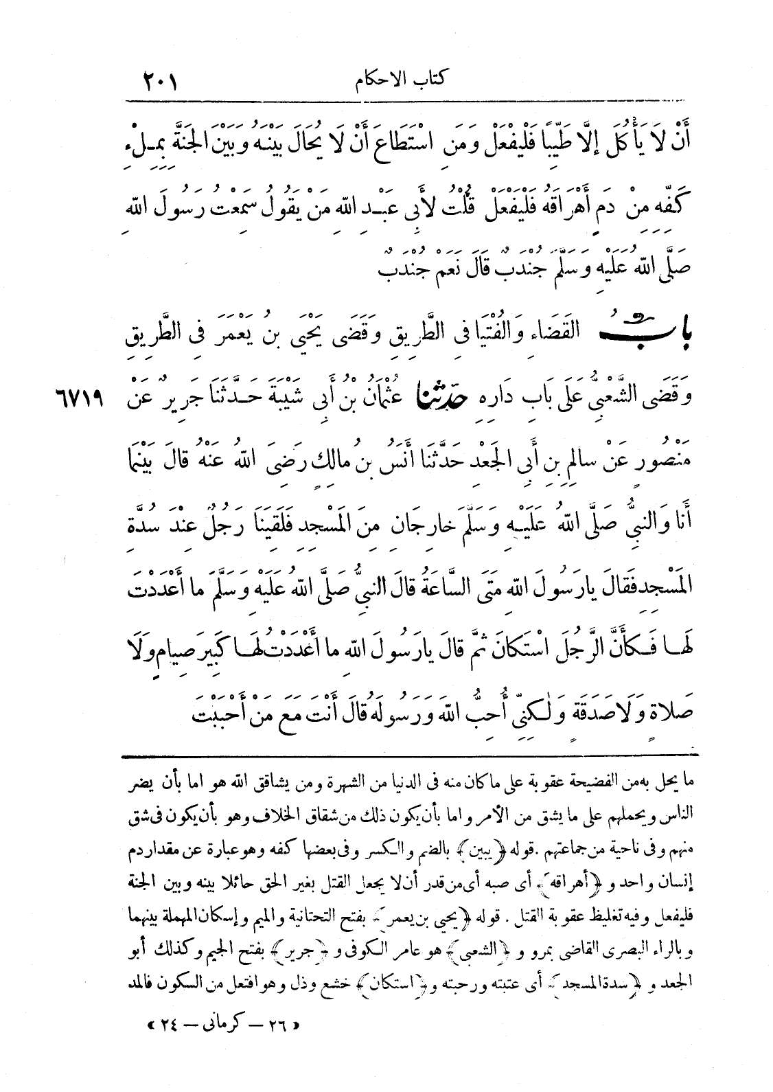 6719 - حَدَّثَنَا عُثْمَانُ بْنُ أَبِي شَيْبَةَ حَدَّثَنَا جَرِيرٌ عَنْ مَنْصُورٍ عَنْ سَالِمِ بْنِ أَبِي الْجَعْدِ حَدَّثَنَا أَنَسُ بْنُ مَالِكٍ رَضِيَ اللَّهُ عَنْهُ قَالَ بَيْنَمَا أَنَا وَالنَّبِيُّ صَلَّى اللَّهُ عَلَيْهِ وَسَلَّمَ خَارِجَانِ مِنْ الْمَسْجِدِ فَلَقِيَنَا رَجُلٌ عِنْدَ سُدَّةِ الْمَسْجِدِ فَقَالَ يَا رَسُولَ اللَّهِ مَتَى السَّاعَةُ قَالَ النَّبِيُّ صَلَّى اللَّهُ عَلَيْهِ وَسَلَّمَ مَا أَعْدَدْتَ لَهَا فَكَأَنَّ الرَّجُلَ اسْتَكَانَ ثُمَّ قَالَ يَا رَسُولَ اللَّهِ مَا أَعْدَدْتُ لَهَا كَبِيرَ صِيَامٍ وَلَا صَلَاةٍ وَلَا صَدَقَةٍ وَلَكِنِّي أُحِبُّ اللَّهَ وَرَسُولَهُ قَالَ أَنْتَ مَعَ مَنْ أَحْبَبْتَ