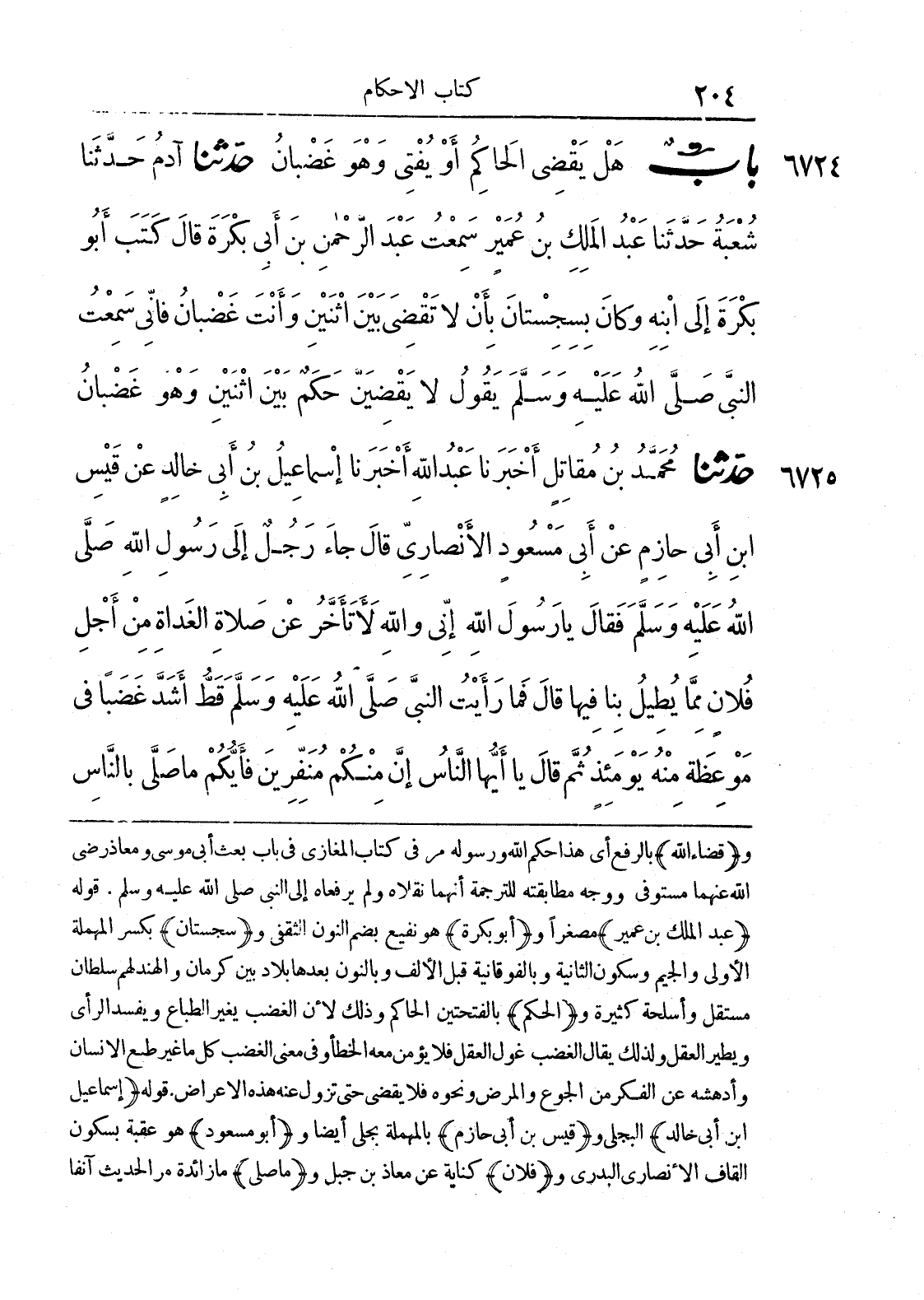 6724 - حَدَّثَنَا آدَمُ حَدَّثَنَا شُعْبَةُ حَدَّثَنَا عَبْدُ الْمَلِكِ بْنُ عُمَيْرٍ سَمِعْتُ عَبْدَ الرَّحْمَنِ بْنَ أَبِي بَكْرَةَ قَالَ كَتَبَ أَبُو بَكْرَةَ إِلَى ابْنِهِ وَكَانَ بِسِجِسْتَانَ بِأَنْ لَا تَقْضِيَ بَيْنَ اثْنَيْنِ وَأَنْتَ غَضْبَانُ فَإِنِّي سَمِعْتُ النَّبِيَّ صَلَّى اللَّهُ عَلَيْهِ وَسَلَّمَ يَقُولُ لَا يَقْضِيَنَّ حَكَمٌ بَيْنَ اثْنَيْنِ وَهُوَ غَضْبَانُ
