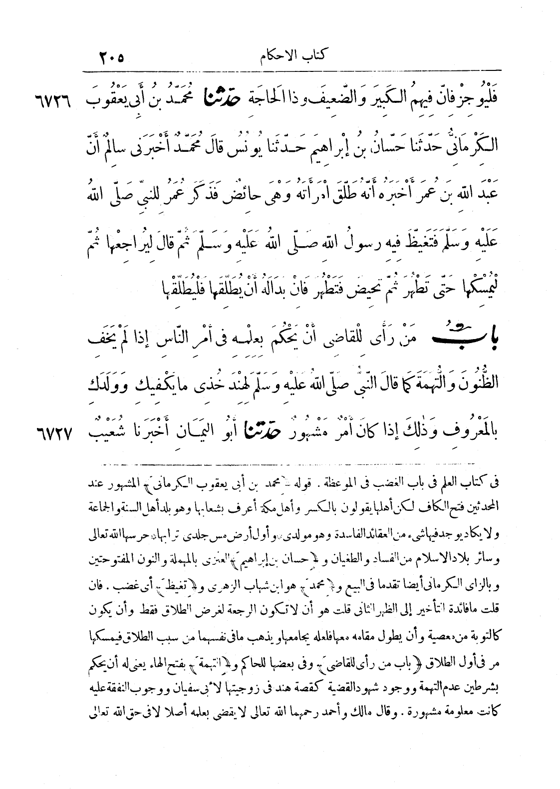 في كتاب العلم في باب الغضب في الموعظة. قوله (محمد بن أبي يعقوب الكرماني) المشهور عند المحدثين فتح الكاف لكن أهلها يقولون بالكسر وأهل مكة أعرف بشعابها وهو بلد أهل السنة والجماعة ولا يكاد يوجد فيها شيء من العقائد الفاسدة وهو مولدي وأول أرض مس جلدي ترابها حرسها الله تعالى وسائر بلاد الإسلام من الفساد والطغيان و (حسان بن إبراهيم) العنزي بالمهملة والنون المفتوحتين وبالزاي الكرماني أيضا تقدما في البيع و (محمد) هو ابن شهاب الزهري و (تغيط) أي غضب. فان قلت ما فائدة التأخير إلى الظهر الثاني قلت هو أن لا تكون الرجعة لغرض الطلاق فقط وأن يكون كالتوبة من معصية وأن يطول مقامه معها فلعله يجامعها ويذهب ما في نفسها من سبب الطلاق فيمسكها مر في أول الطلاق (باب من رأى للقاضي) وفي بعضها للحاكم و (التهمة) بفتح الهاء يعني له أن يحكم بشرطين عدم التهمة ووجود شهود القضية كقصة هند في زوجيتها لأبي سفيان ووجوب النفقة عليه كانت معلومة مشهورة، وقال مالك وأحمد رحمهما الله تعالى لا يقضي بعلمه أصلا لا في حق الله تعالى
