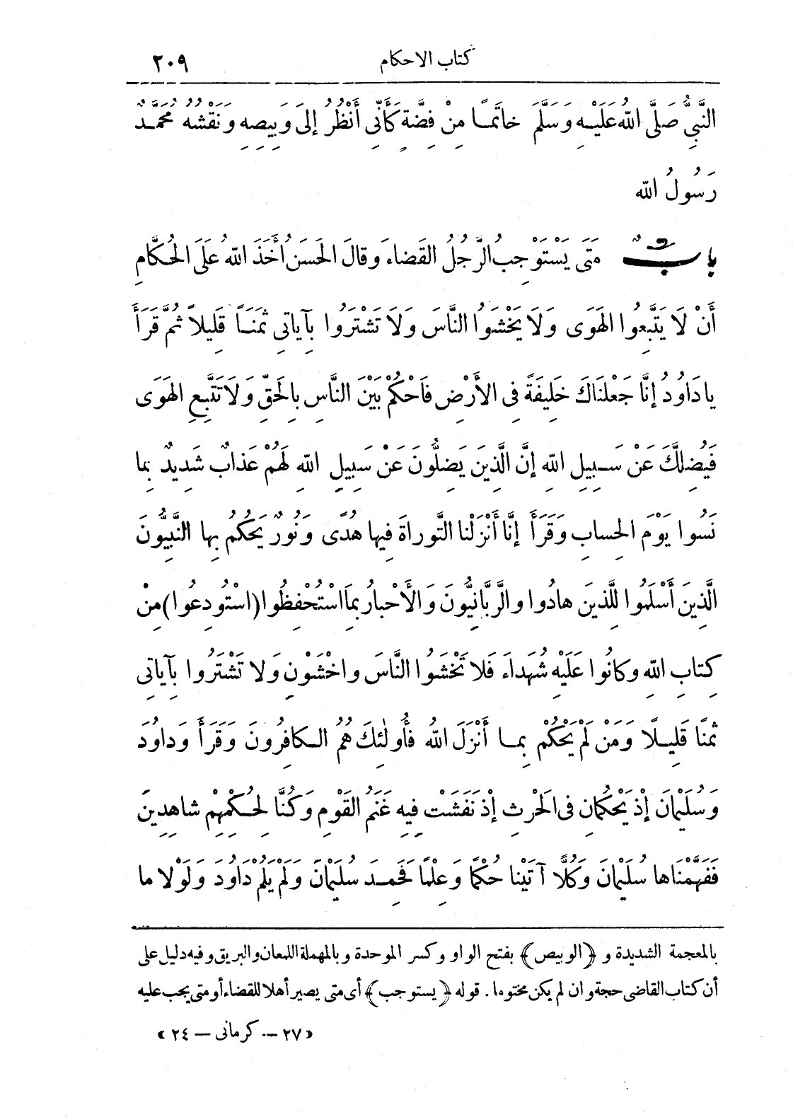 وَقَالَ الْحَسَنُ أَخَذَ اللَّهُ عَلَى الْحُكَّامِ أَنْ لَا يَتَّبِعُوا الْهَوَى وَلَا يَخْشَوْا النَّاسَ وَلَا يَشْتَرُوا بِآيَاتِي ثَمَنًا قَلِيلًا ثُمَّ قَرَأَ {يَا دَاوُدُ إِنَّا جَعَلْنَاكَ خَلِيفَةً فِي الْأَرْضِ فَاحْكُمْ بَيْنَ النَّاسِ بِالْحَقِّ وَلَا تَتَّبِعْ الْهَوَى فَيُضِلَّكَ عَنْ سَبِيلِ اللَّهِ إِنَّ الَّذِينَ يَضِلُّونَ عَنْ سَبِيلِ اللَّهِ لَهُمْ عَذَابٌ شَدِيدٌ بِمَا نَسُوا يَوْمَ الْحِسَابِ} وَقَرَأَ {إِنَّا أَنْزَلْنَا التَّوْرَاةَ فِيهَا هُدًى وَنُورٌ يَحْكُمُ بِهَا النَّبِيُّونَ الَّذِينَ أَسْلَمُوا لِلَّذِينَ هَادُوا وَالرَّبَّانِيُّونَ وَالْأَحْبَارُ بِمَا اسْتُحْفِظُوا مِنْ كِتَابِ اللَّهِ وَكَانُوا عَلَيْهِ شُهَدَاءَ فَلَا تَخْشَوْا النَّاسَ وَاخْشَوْنِ وَلَا تَشْتَرُوا بِآيَاتِي ثَمَنًا قَلِيلًا وَمَنْ لَمْ يَحْكُمْ بِمَا أَنْزَلَ اللَّهُ فَأُولَئِكَ هُمْ الْكَافِرُونَ} {بِمَا اسْتُحْفِظُوا} اسْتُوْدِعُوا {مِنْ كِتَابِ اللَّهِ} وَقَرَأَ {وَدَاوُدَ وَسُلَيْمَانَ إِذْ يَحْكُمَانِ فِي الْحَرْثِ إِذْ نَفَشَتْ فِيهِ غَنَمُ الْقَوْمِ وَكُنَّا لِحُكْمِهِمْ شَاهِدِينَ فَفَهَّمْنَاهَا سُلَيْمَانَ وَكُلًّا آتَيْنَا حُكْمًا وَعِلْمًا} فَحَمِدَ سُلَيْمَانَ وَلَمْ يَلُمْ دَاوُدَ وَلَوْلَا مَا