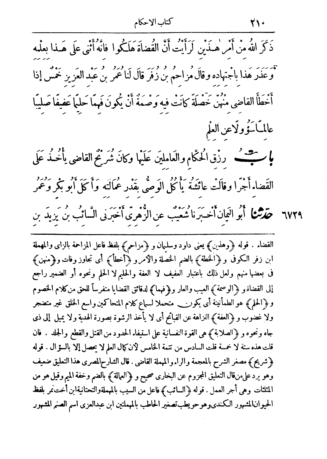 القضاء, قوله (وهذين) يعني داود وسليمان و (مزاحم) بلفظ فاعل المزاحمة بالزاي والمهملة ابن زفر الكوفي و (الخطة) بالضم الخصلة والأمر و (أخطأ) أي تجاوز وفات و (منهن) في بعضها منهم ولعل ذلك باعتبار العفيف لا العفة والحليم لا الحلم ونحوه أو الضمير راجع إلى القضاء و (الوصمة) العيب والعار و (فهما) لدقائق القضايا متفرسا للحق من كلام الخصوم و (الحلم) هو الطمأنينة أي يكون متحملا لسماع كلام المتحاكمين واسع الخلق غير متضجر ولا غضوب و (العفة) النزاهة عن القبائح أي لا يأخذ الرشوة بصورة الهدية ولا يميل إلى ذي جاه ونحوه و (الصلابة) هي القوة النفسانية على استيفاء الحدود من القتل والقطع والجلد, فان قلت هذه ستة لا خمسة قلت السادس من تتمة الخامس لأن كمال العلم لا يحصل إلا بالسؤال , قوله (شريح) مصغر الشرح بالمعجمة والراء والمهملة القاضي, قال الشارح المصري هذا التعليق ضعيف وهو يرد على من قال التعليق المجزوم عن البخاري و (العمالة) بالضم وخفة الميم وقيل هو من المثلثات وهي أجر العمل, قوله (السائب) فاعل من السيب بالمهملة والتحتانية ابن أخت نمر بلفظ الحيوان المشهور الكندي وهو حويطب تصغير الحاطب بالمهملتين ابن عبد العزي اسم الصنم المشهور
