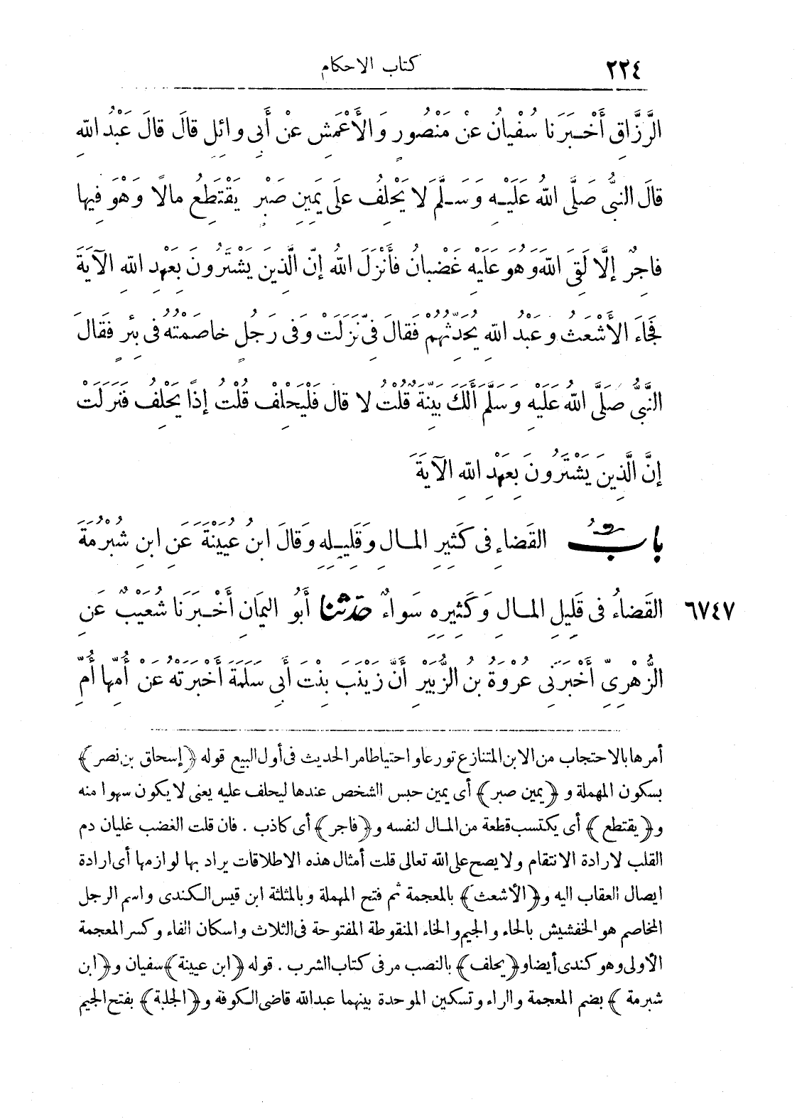 أمرها بالاحتجاب من الابن المتنازع تورعا واحتياطا مر الحديث في أول البيع قوله (إسحاق بن نصر) بسكون المهملة و (يمين صبر) أي يمين حبس الشخص عندها ليحلف عليه يعني لا يكون سهوا منه و (يقتطع) أي يكتسب قطعة من المال لنفسه و (فاجر) أي كاذب. فإن قلت الغضب غليان دم القلب لإرادة الانتقام ولا يصح على الله تعالى قلت أمثال هذه الاطلاقات يراد بها لوازمها أي إرادة إيصال العقاب إليه و (الأشعث) بالمعجمة ثم فتح المهملة وبالمثلثة ابن قيس الكندي واسم الرجل المخاصم هو الخفشيش بالحاء والجيم والخاء المنقوطة المفتوحة في الثلاث وإسكان الفاء وكسر المعجمة الأولى وهو كندي أيضا و (يحلف) بالنصب مر في كتاب الشرب. قوله (ابن عيينة) سفيان و (ابن شبرمة) بضم المعجمة والراء وتسكين الموحدة بينهما عبد الله قاضي الكوفة و (الجلبة) بفتح الجيم