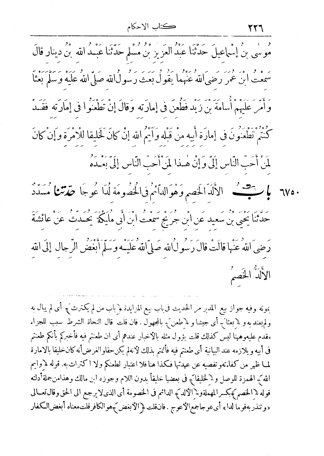 6750 - حَدَّثَنَا مُسَدَّدٌ حَدَّثَنَا يَحْيَى بْنُ سَعِيدٍ عَنْ ابْنِ جُرَيْجٍ سَمِعْتُ ابْنَ أَبِي مُلَيْكَةَ يُحَدِّثُ عَنْ عَائِشَةَ رَضِيَ اللَّهُ عَنْهَا قَالَتْ قَالَ رَسُولُ اللَّهِ صَلَّى اللَّهُ عَلَيْهِ وَسَلَّمَ أَبْغَضُ الرِّجَالِ إِلَى اللَّهِ الْأَلَدُّ الْخَصِمُ