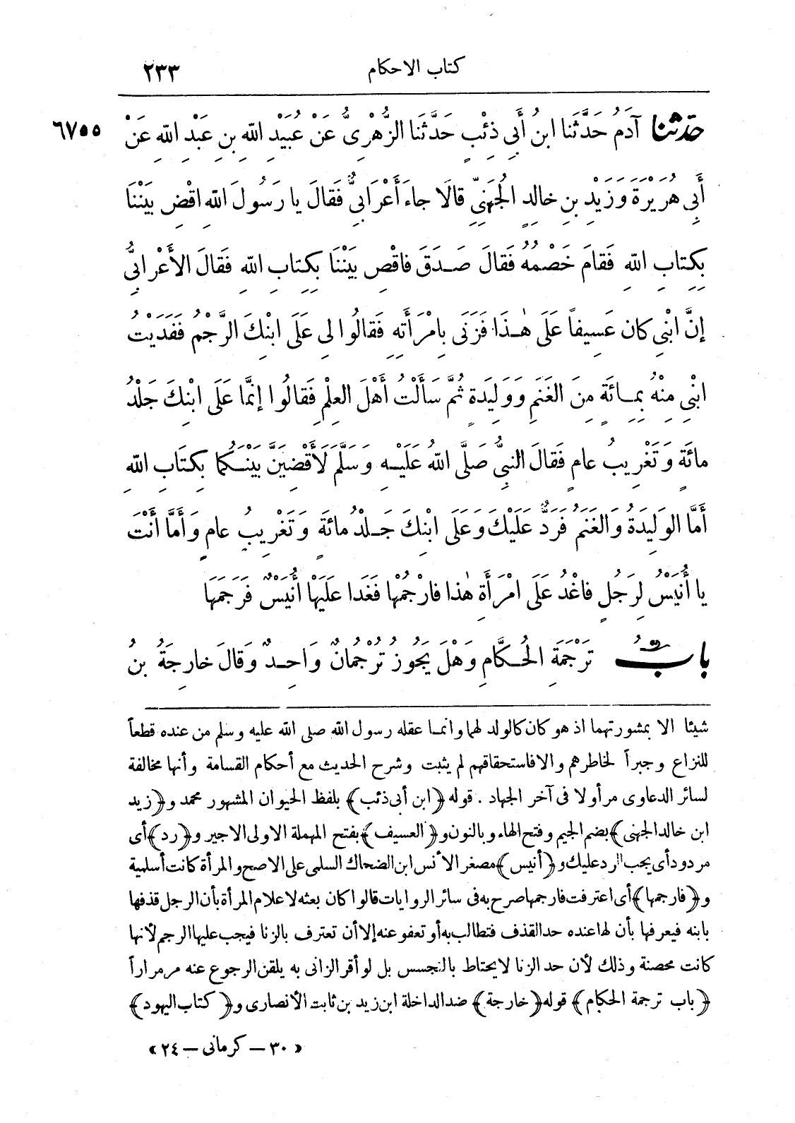 شيئا إلا بمشورتهما إذ هو كان كالولد لهما وإنما عقله رسول الله صلى الله عليه وسلم من عنده قطعا للنزاع وجبرا لخاطرهم وإلا فاستحقاقهم لم يثبت وشرح الحديث مع أحكام القسامة وأنها مخالفة لسائر الدعاوي مر أولا في آخر الجهاد. قوله (ابن أبي ذئب) بلفظ الحيوان المشهور محمد و (زيد ابن خالد الجهني) بضم الجيم وفتح الهاء وبالنون و (العسيف) بفتح المهملة الأولى الأجير و (رد) أي مردود أي يجب الرد عليك و (أنيس) مصغر الأنس ابن الضحاك السلمي على الأصح والمرأة كانت أسلمية و (فارجمها) أي اعترفت فارجمها صرح به في سائر الروايات قالوا كان بعثه لإعلام المرأة بأن الرجل قذفها بابنه فيعرفها بأن لها عنده حد القذف فتطالب به أو تعفو عنه إلا أن تعترف بالزنا فيجب عليها الرجم لأنها كانت محصنة وذلك لأن حد الزنا لا يحتاط بالتجسس بل لو أقر الزاني به يلقن الرجوع عنه مر مرارا (باب ترجمة الحكام) قوله (خارجة) ضد الداخلة ابن زيد بن ثابت الأنصاري و (كتاب اليهود)