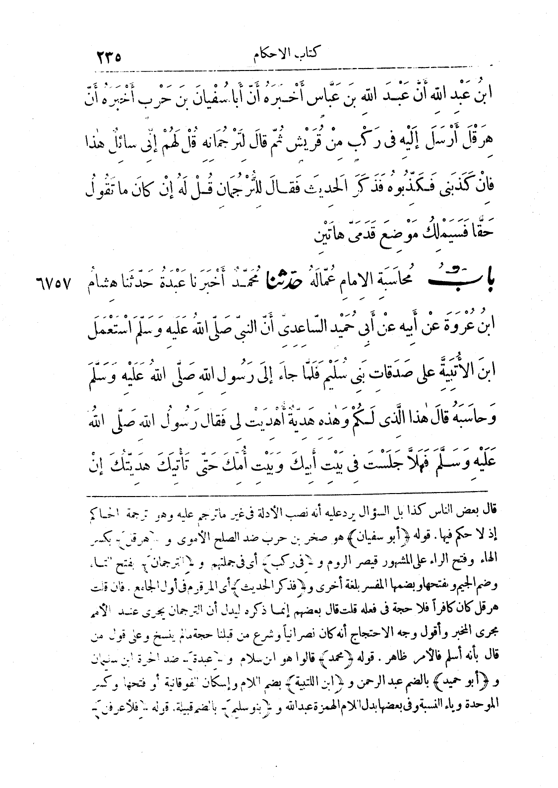 قال بعض الناس كذا بل السؤال يرد عليه أنه نصب الأدلة في غير ما ترجم عليه وهو ترجمة الحاكم إذ لا حكم فيها، قوله (أبو سفيان) هو صخر بن حرب ضد الصلح الأموي و (هرقل) بكسر الهاء وفتح الراء على المشهور قيصر الروم و (في ركب) أي في جملتهم و (الترجمان) بفتح التاء وضم الجيم وبفتحها وبضمها المفسر بلغة أخرى و (فذكر الحديث) أي المرقوم في أول الجامع. فان قلت هرقل كان كافرا فلا حجة في فعله قلت قال بعضهم إنما ذكره ليدل أن الترجمان يجري عند الأمم مجرى المخبر وأقول وجه الاحتجاج أنه كان نصرانيا وشرع من قبلنا حجة ما لم ينسخ وعلى قول من قال بأنه أسلم فالأمر ظاهر. قوله (محمد) قالوا هو ابن سلام و (عبده) ضد الحرة ابن سليمان و (أبو حميد) بالضم عبد الرحمن و (ابن اللتبية) بضم اللام وإسكان الفوقانية أو فتحها وكسر الموحدة وياء النسبة وفي بعضها بدل اللام الهمزة عبد الله و (بنو سليم) بالضم قبيلة. قوله (فلأعرفن)