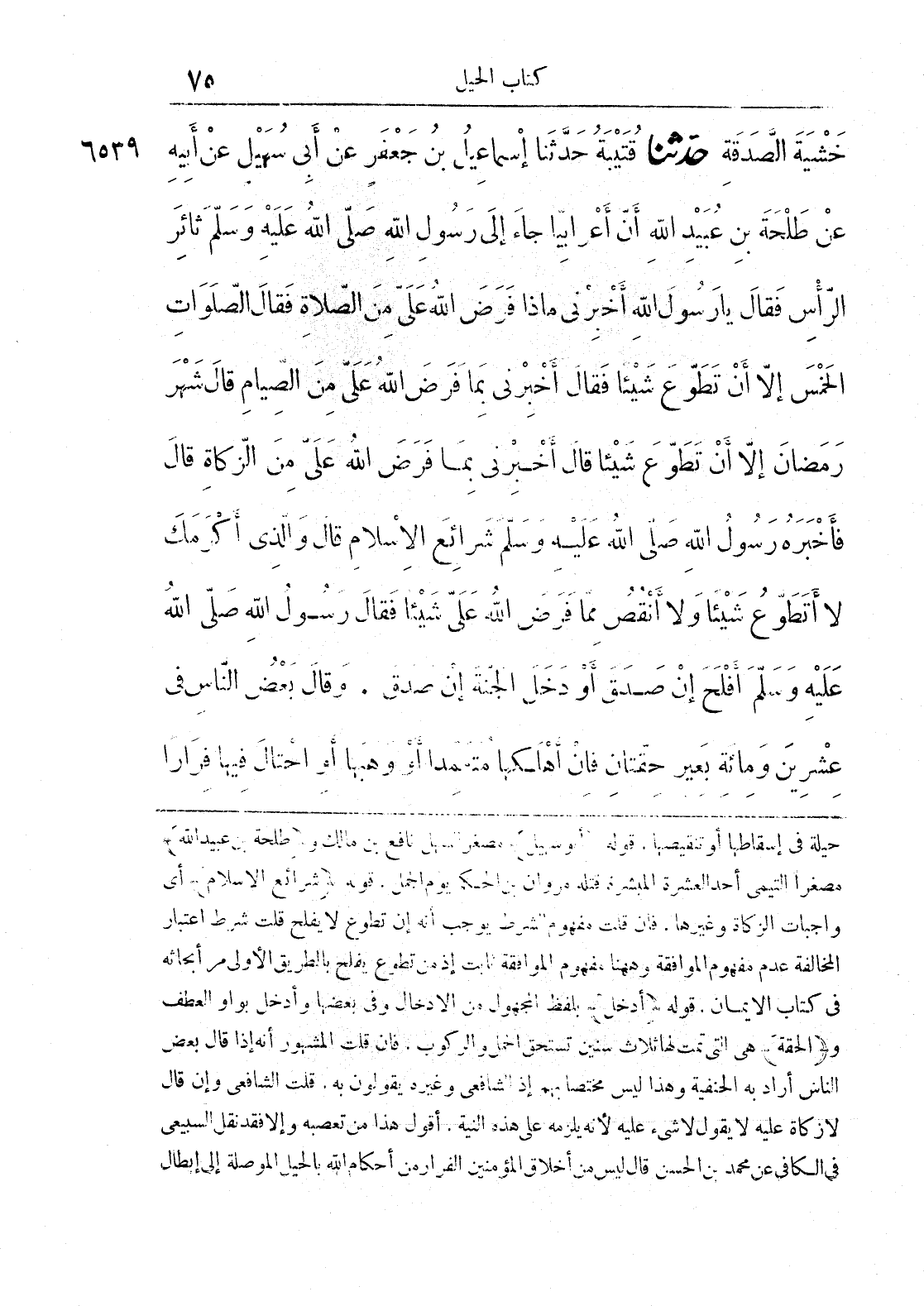 6539 - حَدَّثَنَا قُتَيْبَةُ حَدَّثَنَا إِسْمَاعِيلُ بْنُ جَعْفَرٍ عَنْ أَبِي سُهَيْلٍ عَنْ أَبِيهِ عَنْ طَلْحَةَ بْنِ عُبَيْدِ اللَّهِ أَنَّ أَعْرَابِيًّا جَاءَ إِلَى رَسُولِ اللَّهِ صَلَّى اللَّهُ عَلَيْهِ وَسَلَّمَ ثَائِرَ الرَّاسِ فَقَالَ يَا رَسُولَ اللَّهِ أَخْبِرْنِي مَاذَا فَرَضَ اللَّهُ عَلَيَّ مِنْ الصَّلَاةِ فَقَالَ الصَّلَوَاتِ الْخَمْسَ إِلَّا أَنْ تَطَوَّعَ شَيْئًا فَقَالَ أَخْبِرْنِي بِمَا فَرَضَ اللَّهُ عَلَيَّ مِنْ الصِّيَامِ قَالَ شَهْرَ رَمَضَانَ إِلَّا أَنْ تَطَوَّعَ شَيْئًا قَالَ أَخْبِرْنِي بِمَا فَرَضَ اللَّهُ عَلَيَّ مِنْ الزَّكَاةِ قَالَ فَأَخْبَرَهُ رَسُولُ اللَّهِ صَلَّى اللَّهُ عَلَيْهِ وَسَلَّمَ شَرَائِعَ الْإِسْلَامِ قَالَ وَالَّذِي أَكْرَمَكَ لَا أَتَطَوَّعُ شَيْئًا وَلَا أَنْقُصُ مِمَّا فَرَضَ اللَّهُ عَلَيَّ شَيْئًا فَقَالَ رَسُولُ اللَّهِ صَلَّى اللَّهُ عَلَيْهِ وَسَلَّمَ أَفْلَحَ إِنْ صَدَقَ أَوْ دَخَلَ الْجَنَّةَ إِنْ صَدَقَ وَقَالَ بَعْضُ النَّاسِ فِي عِشْرِينَ وَمِائَةِ بَعِيرٍ حِقَّتَانِ فَإِنْ أَهْلَكَهَا مُتَعَمِّدًا أَوْ وَهَبَهَا أَوْ احْتَالَ فِيهَا فِرَارًا
