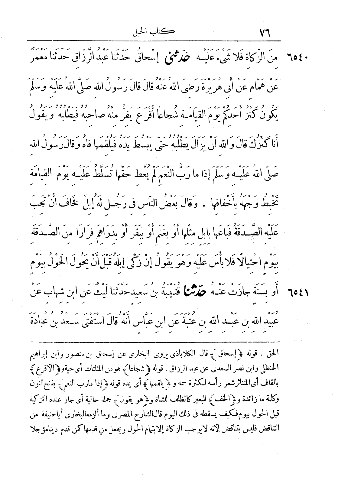 6540 - حَدَّثَنِي إِسْحَاقُ حَدَّثَنَا عَبْدُ الرَّزَّاقِ حَدَّثَنَا مَعْمَرٌ عَنْ هَمَّامٍ عَنْ أَبِي هُرَيْرَةَ رَضِيَ اللَّهُ عَنْهُ قَالَ قَالَ رَسُولُ اللَّهِ صَلَّى اللَّهُ عَلَيْهِ وَسَلَّمَ يَكُونُ كَنْزُ أَحَدِكُمْ يَوْمَ الْقِيَامَةِ شُجَاعًا أَقْرَعَ يَفِرُّ مِنْهُ صَاحِبُهُ فَيَطْلُبُهُ وَيَقُولُ أَنَا كَنْزُكَ قَالَ وَاللَّهِ لَنْ يَزَالَ يَطْلُبُهُ حَتَّى يَبْسُطَ يَدَهُ فَيُلْقِمَهَا فَاهُ وَقَالَ رَسُولُ اللَّهِ صَلَّى اللَّهُ عَلَيْهِ وَسَلَّمَ إِذَا مَا رَبُّ النَّعَمِ لَمْ يُعْطِ حَقَّهَا تُسَلَّطُ عَلَيْهِ يَوْمَ الْقِيَامَةِ فَتَخْبِطُ وَجْهَهُ بِأَخْفَافِهَا وَقَالَ بَعْضُ النَّاسِ فِي رَجُلٍ لَهُ إِبِلٌ فَخَافَ أَنْ تَجِبَ عَلَيْهِ الصَّدَقَةُ فَبَاعَهَا بِإِبِلٍ مِثْلِهَا أَوْ بِغَنَمٍ أَوْ بِبَقَرٍ أَوْ بِدَرَاهِمَ فِرَارًا مِنْ الصَّدَقَةِ بِيَوْمٍ احْتِيَالًا فَلَا بَاسَ عَلَيْهِ وَهُوَ يَقُولُ إِنْ زَكَّى إِبِلَهُ قَبْلَ أَنْ يَحُولَ الْحَوْلُ بِيَوْمٍ أَوْ بِسِتَّةٍ جَازَتْ عَنْهُ