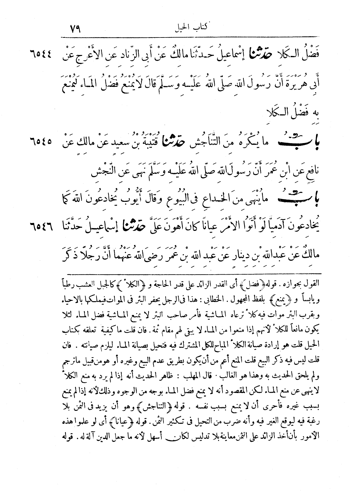القول بجوازه. قوله (فضل) أي القدر الزائد على قدر الحاجة و (الكلاً) كالجبل العشب رطبًا ويابسًا و (يمنع) بلفظ المجهول. الخطابي: هذا في الرجل يحفر البئر في الموات فيملكها بالإحياء وبقرب البئر موات فيه كلأ ترعاه الماشية فأمر صاحب البئر لا يمنع الماشية فضل الماء لئلا يكون مانعًا للكلأ لأنهم اذا منعوا من الماء لا يبقى لهم مقام ثمة. فان قلت ما كيفية تعلقه بكتاب الحيل قلت هو إرادة صيانة الكلأ المباح للكل المشترك فيه فتحيل بصيانة الماء ليلزم صيانته، فإن قلت ليس فيه ذكر البيع قلت المنع أعم من أن يكون بطريق عدم البيع وغيره أو هو من قبيل ما ترجم ولم يلحق الحديث به وهذا هو الغالب. قال المهلب: ظاهر الحديث أنه إذا لم يرد به منع الكلأ لا ينهى عن منع الماء لكن المقصود أنه لا يمنع فضل الماء بوجه من الوجوه وذلك لأنه إذا لم يمنع بسبب غيره فأحرى أن لا يمنع بسبب نفسه. قوله (التناجش) وهو أن يزيد في الثمن بلا رغبة فيه ليوقع الغير فيه وأنه ضرب من التحيل في تكثير الثمن، قوله (عيانا) أي لو علموا هذه الأمور بأن أخذ الزائد على الثمن معاينة بلا تدليس لكان أسهل لأنه ما جعل الدين آلة له. قوله