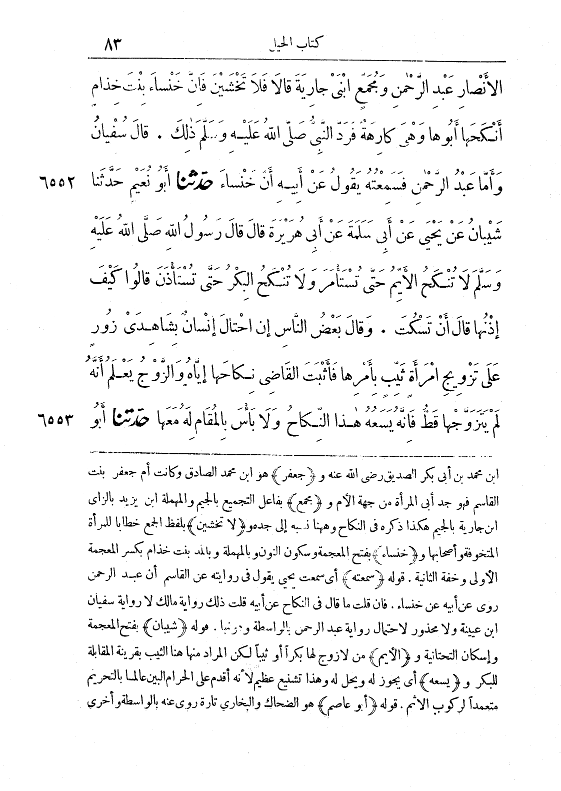 ابن محمد بن أبي بكر الصديق رضي الله عنه و (جعفر) هو ابن محمد الصادق وكانت أم جعفر بنت القاسم فهو جد أبي المرأة من جهة الأم و (مجمع) بفاعل التجميع بالجيم والمهملة ابن يزيد بالزاي ابن جارية بالجيم هكذا ذكره في النكاح وههنا نسبه إلى جده و (لا تخشين) بلفظ الجمع خطابا للمرأة المتخوفة وأصحابها و (خنساء) بفتح المعجمة وسكون النون وبالمهملة وبالمد بنت خذام بكسر المعجمة الأولى وخفة الثانية. قوله (سمعته) أي سمعت يحي يقول في روايته عن القاسم أن عبد الرحمن روى عن أبيه عن خنساء. فان قلت ما قال في النكاح عن أبيه قلت ذلك رواية مالك لا رواية سفيان ابن عيينة ولا محذور لاحتمال رواية عبد الرحمن بالواسطة ودونها. قوله (شيبان) بفتح المعجمة وإسكان التحتانية و (الأيم) من لا زوج لها بكرا أو ثيبا لكن المراد منها هنا الثيب بقرينة المقابلة للبكر و (يسعه) أي يجوز له ويحل له وهذا تشنيع عظيم لأنه أقدم على الحرام البين عالما بالتحريم متعمدا لركوب الإثم، قوله (أبو عاصم) هو الضحاك والبخاري تارة روى عنه بالواسطة وأخرى