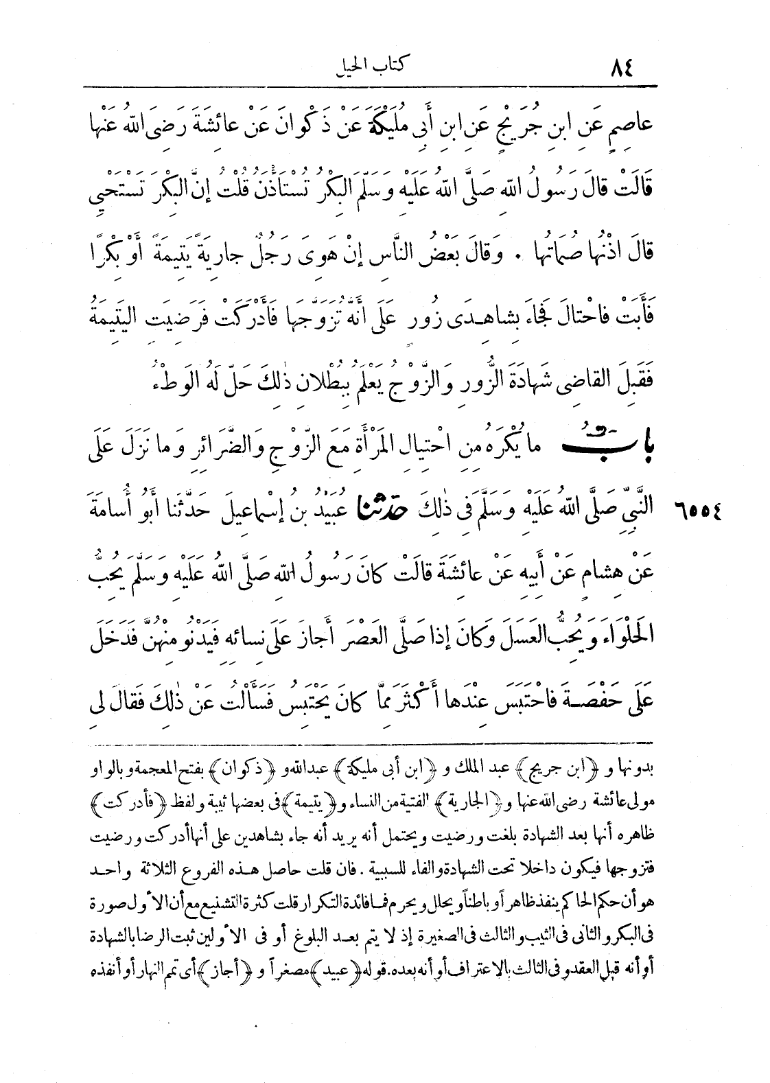 6554 - حَدَّثَنَا عُبَيْدُ بْنُ إِسْمَاعِيلَ حَدَّثَنَا أَبُو أُسَامَةَ عَنْ هِشَامٍ عَنْ أَبِيهِ عَنْ عَائِشَةَ قَالَتْ كَانَ رَسُولُ اللَّهِ صَلَّى اللَّهُ عَلَيْهِ وَسَلَّمَ يُحِبُّ الْحَلْوَاءَ وَيُحِبُّ الْعَسَلَ وَكَانَ إِذَا صَلَّى الْعَصْرَ أَجَازَ عَلَى نِسَائِهِ فَيَدْنُو مِنْهُنَّ فَدَخَلَ عَلَى حَفْصَةَ فَاحْتَبَسَ عِنْدَهَا أَكْثَرَ مِمَّا كَانَ يَحْتَبِسُ فَسَأَلْتُ عَنْ ذَلِكَ فَقَالَ لِي