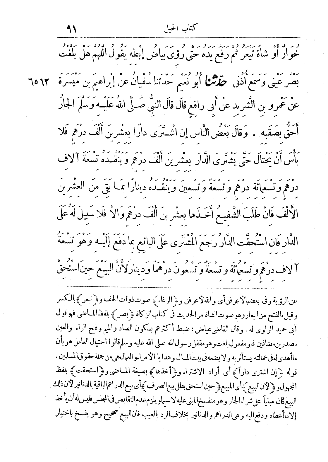 6562 - حَدَّثَنَا أَبُو نُعَيْمٍ حَدَّثَنَا سُفْيَانُ عَنْ إِبْرَاهِيمَ بْنِ مَيْسَرَةَ عَنْ عَمْرِو بْنِ الشَّرِيدِ عَنْ أَبِي رَافِعٍ قَالَ قَالَ النَّبِيُّ صَلَّى اللَّهُ عَلَيْهِ وَسَلَّمَ الْجَارُ أَحَقُّ بِصَقَبِهِ وَقَالَ بَعْضُ النَّاسِ إِنْ اشْتَرَى دَارًا بِعِشْرِينَ أَلْفَ دِرْهَمٍ فَلَا بَاسَ أَنْ يَحْتَالَ حَتَّى يَشْتَرِيَ الدَّارَ بِعِشْرِينَ أَلْفَ دِرْهَمٍ وَيَنْقُدَهُ تِسْعَةَ آلَافِ دِرْهَمٍ وَتِسْعَ مِائَةِ دِرْهَمٍ وَتِسْعَةً وَتِسْعِينَ وَيَنْقُدَهُ دِينَارًا بِمَا بَقِيَ مِنْ الْعِشْرِينَ الْأَلْفَ فَإِنْ طَلَبَ الشَّفِيعُ أَخَذَهَا بِعِشْرِينَ أَلْفَ دِرْهَمٍ وَإِلَّا فَلَا سَبِيلَ لَهُ عَلَى الدَّارِ فَإِنْ اسْتُحِقَّتْ الدَّارُ رَجَعَ الْمُشْتَرِي عَلَى الْبَائِعِ بِمَا دَفَعَ إِلَيْهِ وَهُوَ تِسْعَةُ آلَافِ دِرْهَمٍ وَتِسْعُ مِائَةٍ وَتِسْعَةٌ وَتِسْعُونَ دِرْهَمًا وَدِينَارٌ لِأَنَّ الْبَيْعَ حِينَ اسْتُحِقَّ
