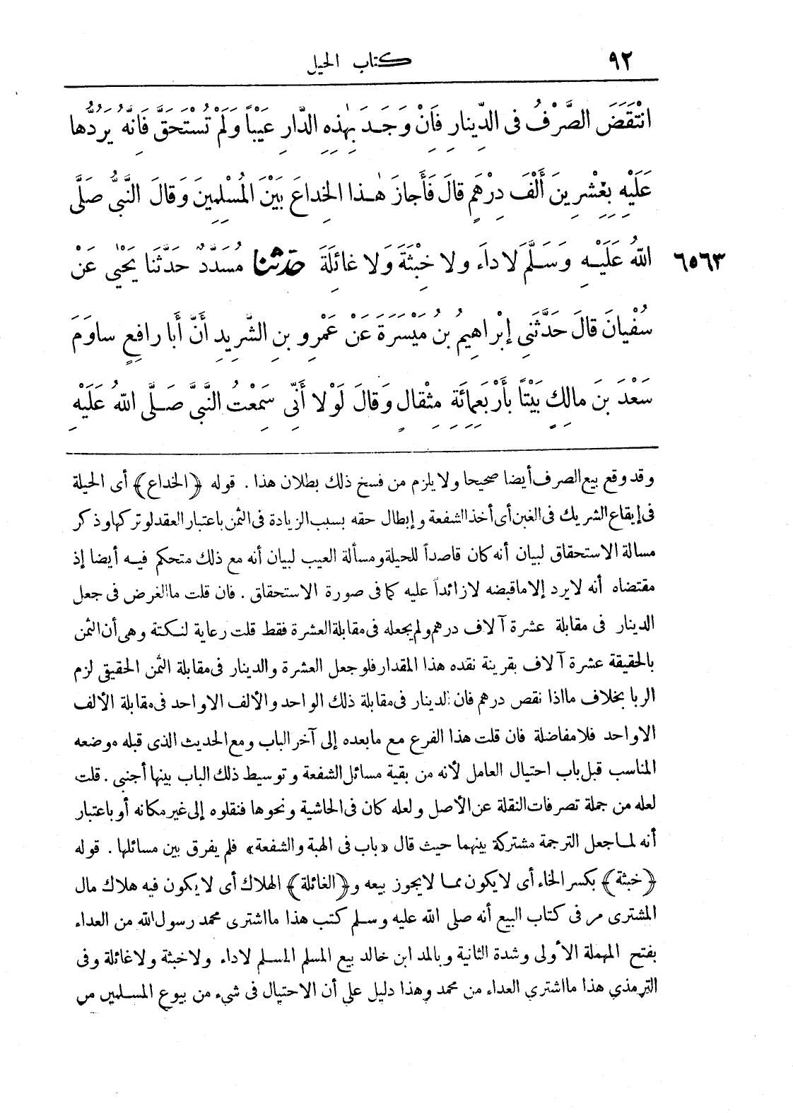 وقد وقع بيع الصرف أيضا صحيحا ولا يلوم من فسح ذلك بطلان هذا , قوله (الخداع) أي الحيلة في إيقاع في الغبن أي أخذ الشفعة وإبطال حقه بسبب الزيادة في الثمن باعتبار العقد لو تركها وذكر مسألة الاستحقاق لبيان أنه كان قاصدا للحيلة ومسألة العيب لبيان أنه مع ذلك متحكم فيه أيضا إذ مقتضاه أنه لا يرد إلا ما قبضه لا زائدا عليه كما في صورة الاستحقاق , فان قلت ما الغرض في جعل الدينار في مقابلة عشرة آلاف درهم ولم يجعله في مقابلة العشرة فقط قلت رعاية لنكتة وهي أن الثمن بالحقيقة عشرة آلاف بقرينة نقده هذا المقدار فلو جعل العشرة والدينار في مقابلة الثمن الحقيقي لزم الربا بخلاف ما إذا نقص درهم فان الدينار في مقابلة ذلك الواحد والألف إلا واحد في مقابلة الألف إلا واحد فلا مفاضلة فان قلت هذا الفرع مع ما بعده إلى آخره الباب ومع الحديث الذي قبله موضعه المناسب قبل باب احتيال العامل لأنه من بقية مسائل الشفعة وتوسيط ذلك الباب بينها أجنبي , قلت لعله من جملة تصرفات النقلة عن الأصل ولعله كان في الحاشية ونحوها فنقلوه إلى غير مكانه أو باعتبار أنه لما جعل الترجمة مشتركة بينهما حيث قال «باب في الهبة والشفعة» فلم يفرق بين مسائلها , قوله (خبثة) بكسر الخاء أي لا يكون مما لا يجوز بيعه و (الغائلة) الهلاك أي لا يكون فيه هلاك مال المشتري مر في كتاب البيع أنه صلى الله عليه وسلم كتب هذا ما اشترى محمد رسول الله من العداء بفتح المهملة الأولى وشدة الثانية وبالمد ابن خالد بيع المسلم المسلم لأداء ولا خبثة ولا غائلة وفي الترمذي هذا ما اشترى العداء من محمد وهذا دليل على أن الاحتيال في شيء من بيوع المسلمين من