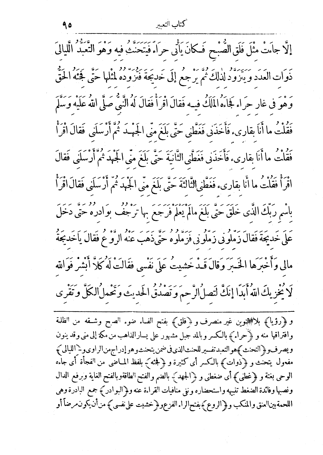 و (رؤيا) بلا تنوين غير منصرف و (فلق) بفتح الفاء ضوء الصبح وشقة من الظلمة وافتراقها منه و (حراء) بالكسر وبالمد جبل مشهور على يسار الذاهب من مكة إلى منى وقد ينون ويصرف و (التحنث) هو التعبد تفسير للحنث الذي في ضمن يتخنث وهو إدراج من الراوي و (الليالي) مفعول يتحنث و (ذوات) بالكسر أي كثيرة و (فجئه) بلفظ الماضي من الفجأة أي جاءه الوحي بغتة و (غطني) أي ضغطني و (الجهد) بالضم والفتح الطاقة وبالفتح الغاية وبرفع الدال ونصبها وفائدة الضغط تنبيهه واستحضاره ونفى منافيات القراءة عنه و (البوادر) جمع البادرة وهي اللحمة بين العنق والمنكب و (الروع) بفتح الراء الفزع و (خشيت على نفسي من أن يكون مرضًا أو