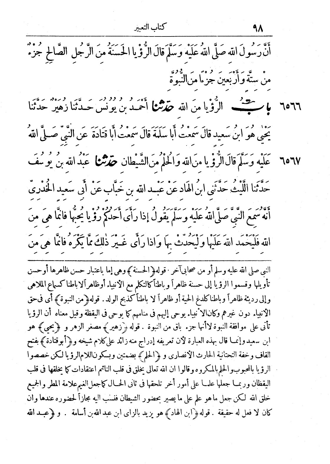 6566 - حَدَّثَنَا أَحْمَدُ بْنُ يُونُسَ حَدَّثَنَا زُهَيْرٌ حَدَّثَنَا يَحْيَى هُوَ ابْنُ سَعِيدٍ قَالَ سَمِعْتُ أَبَا سَلَمَةَ قَالَ سَمِعْتُ أَبَا قَتَادَةَ عَنْ النَّبِيِّ صَلَّى اللَّهُ عَلَيْهِ وَسَلَّمَ قَالَ الرُّؤْيَا الصَّادِقَةُ مِنْ اللَّهِ وَالْحُلْمُ مِنْ الشَّيْطَانِ