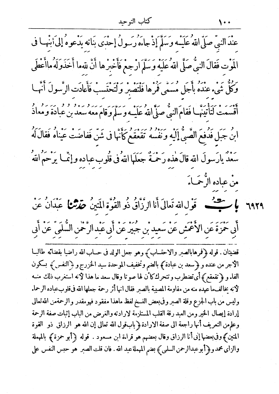 قضيتان، قوله {فمرها بالصبر والاحتساب} وهو جعل الولد في حساب الله راضيا بقضائه طالبا الأجر من عنده و {سعد بن عبادة} بالضم وتخفيف الموحدة سيد الخزرج و {النفس} بسكون الفاء و {تقعقع} أي تضطرب وتتحرك كأن لها صوتا وقال سعد ما هذا لأنه استغرب ذلك منه لأنه يخالف ما عهده منه من مقاومة المصيبة بالصبر فقال إنها أثر رحمة جعلها الله في قلوب عباده الرحماء وليس من باب الجزع وقلة الصبر وفي بعض النسخ لفظ ما هذا مفقود فهو مقدر والرحمة من الله تعالى إرادة إيصال الخير ومن العبد رقة القلب المستلزمة لإرادته والغرض من الباب إثبات صفة الرحمة وعلم من التعريف أنها راجعة إل صفة الإرادة {باب قول الله تعالى إن الله هو الرزاق ذو القوة المتين} وفي بعضها إني أنا الرزاق وقال بعضهم هو قراءة ابن مسعود. قوله {أبو حمزة} بالمهملة والزاي محمد و {أبو عبد الرحمن السلمي} بضم المهملة عبد الله، فإن قلت الصبر هو حبس النفس على