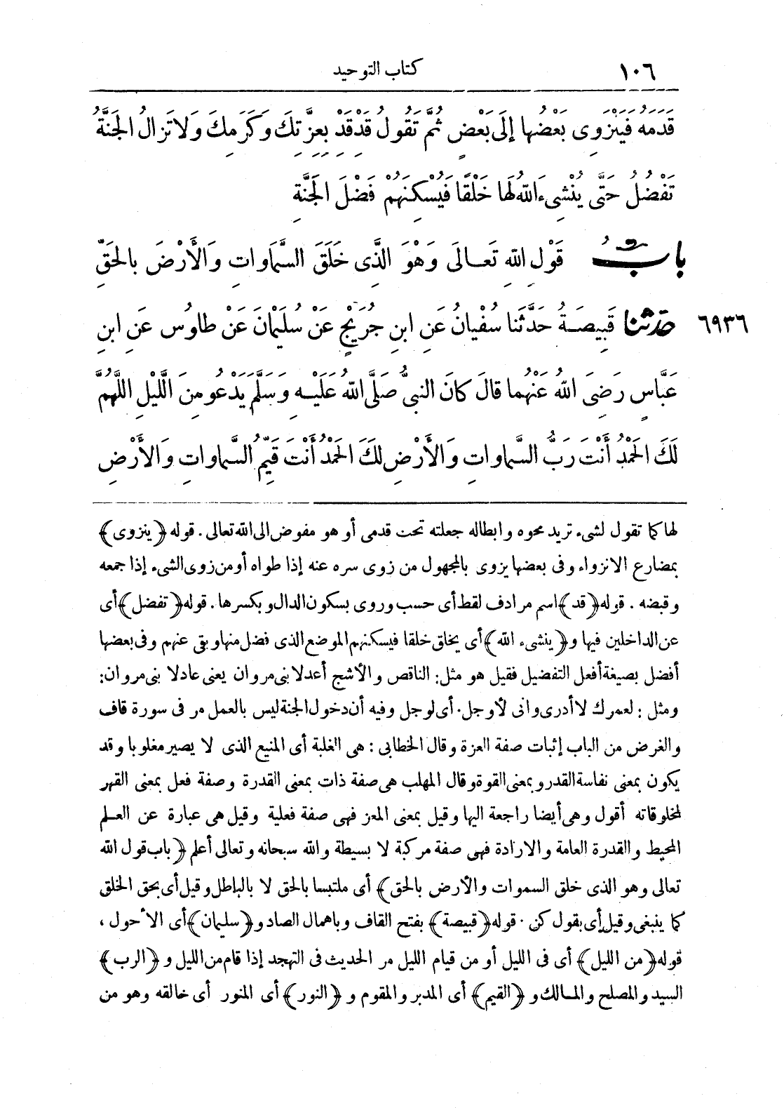 6936 - حَدَّثَنَا قَبِيصَةُ حَدَّثَنَا سُفْيَانُ عَنْ ابْنِ جُرَيْجٍ عَنْ سُلَيْمَانَ عَنْ طَاوُسٍ عَنْ ابْنِ عَبَّاسٍ رَضِيَ اللَّهُ عَنْهُمَا قَالَ كَانَ النَّبِيُّ صَلَّى اللَّهُ عَلَيْهِ وَسَلَّمَ يَدْعُو مِنْ اللَّيْلِ اللَّهُمَّ لَكَ الْحَمْدُ أَنْتَ رَبُّ السَّمَوَاتِ وَالْأَرْضِ لَكَ الْحَمْدُ أَنْتَ قَيِّمُ السَّمَوَاتِ وَالْأَرْضِ