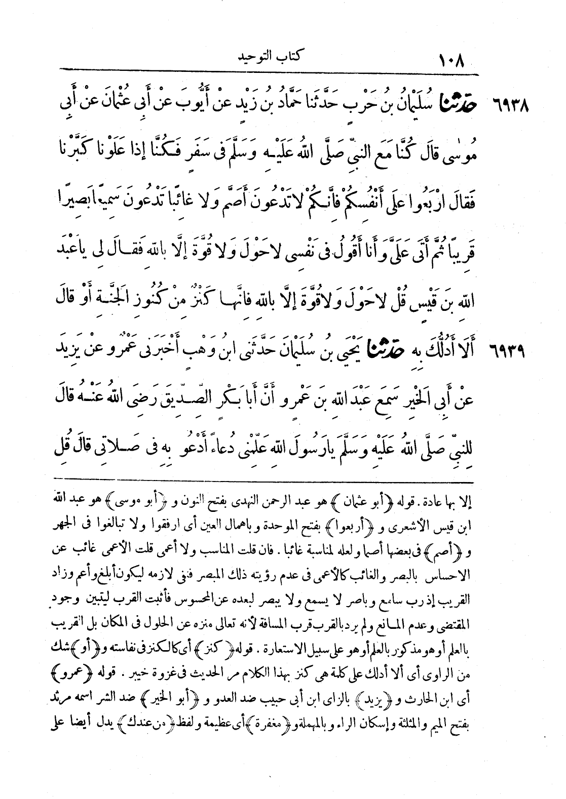 6938 - حَدَّثَنَا سُلَيْمَانُ بْنُ حَرْبٍ حَدَّثَنَا حَمَّادُ بْنُ زَيْدٍ عَنْ أَيُّوبَ عَنْ أَبِي عُثْمَانَ عَنْ أَبِي مُوسَى قَالَ كُنَّا مَعَ النَّبِيِّ صَلَّى اللَّهُ عَلَيْهِ وَسَلَّمَ فِي سَفَرٍ فَكُنَّا إِذَا عَلَوْنَا كَبَّرْنَا فَقَالَ ارْبَعُوا عَلَى أَنْفُسِكُمْ فَإِنَّكُمْ لَا تَدْعُونَ أَصَمَّ وَلَا غَائِبًا تَدْعُونَ سَمِيعًا بَصِيرًا قَرِيبًا ثُمَّ أَتَى عَلَيَّ وَأَنَا أَقُولُ فِي نَفْسِي لَا حَوْلَ وَلَا قُوَّةَ إِلَّا بِاللَّهِ فَقَالَ لِي يَا عَبْدَ اللَّهِ بْنَ قَيْسٍ قُلْ لَا حَوْلَ وَلَا قُوَّةَ إِلَّا بِاللَّهِ فَإِنَّهَا كَنْزٌ مِنْ كُنُوزِ الْجَنَّةِ أَوْ قَالَ أَلَا أَدُلُّكَ بِهِ