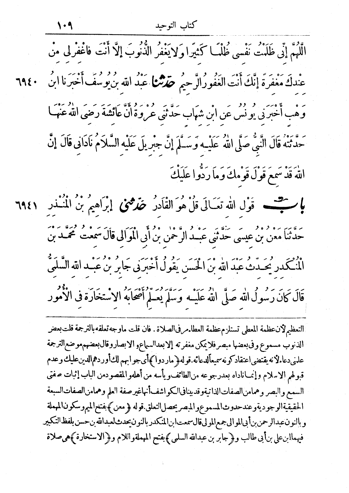 التعظيم لأن عظمة المعطي تستلزم عظمة العطاء مرر في الصلاة، فإن قلت ما وجه تعلقه بالترجمة قلت بعض الذنوب مسموع وفي بعضها مبصر فلا يمكن مغفرته إلا بعد السماع والإبصار وقال بعضهم موضع الترجمة علمني دعاء لأنه يقتضي اعتقاد كونه سميعا لدعائه. قوله {ما ردوا} أي جوابهم لك أوردهم الدين عليك وعدم قبولهم الإسلام وإنما ناداه بعدم رجوعه من الطائف ويأسه من أهله والمقصود من الباب إثبات صفتي السمع والبصر وهما من الصفات الذاتية وقد بينا في الكواشف أنها غير صفة العلم وهما من الصفات السبعة الحقيقة الوجودية وعند حدوث المسموع والمبصر يحدث التعلق. {باب قول الله تعالى قل هو القادر} قوله {معن} بفتح الميم وسكون المهملة وبالنون عبد الرحمن بن أبي المولى قال سمعت ابن المنكدر بالنون يحدث لعبد الله بن حسن بلفظ التكبير فيهما ابن علي بن أبي طالب و {جابر بن عبد الله السلمي} بفتح المهملة واللام و {الاستخارة} هي صلاة