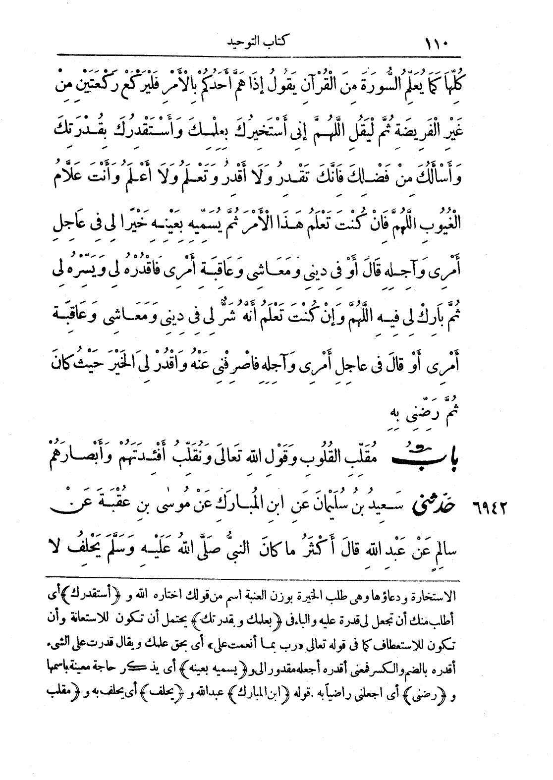 الاستخارة وهي طلب الخيرة بوزن العنبة اسم من قولك اختاره الله و {أستقدرك} أي اطلب منك أن تجعل لي قدرة عليه والباء في {بعلمك وبقدرتك} يحتمل أن تكون للاستعانة وأن تكون للاستعطاف كما في قوله تعالى {رب بما أنعمت علي} أي بحق علمك ويقال قدرت على الشيء أقدره بالضم والكسر فمعنى أقدره أجعله مقدورا إلى و {يسميه بعينه} أي يذكر حاجة معينة باسمها و {رضني} أي اجعلني راضيا به. {باب مقلب القلوب} قوله {ابن المبارك} عبد الله و {يحلف} أي يحلف به و {مقلب