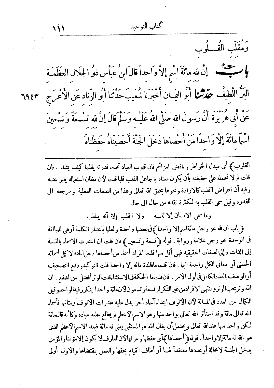 {باب إن لله عز وجل مائة اسم إلا واحدا} في بعضها واحدة ولعلها باعتبار الكلمة أو هي للمبالغة في الوحدة نحو رجل علامة ورواية، قوله {تسع وتسعين} فإن قلت إن اعتبرت الأسماء بالنسبة إلى الذات وإلى الصفات الحقيقية فهي أقل منها قلت المراد أسماء من أحصاها دخل الجنة لا كل أسمائه الحسنى أو معاني الكل راجعة إليها. فإن قلت ما فائدة مائة إلا واحدا قلت التوكيد ودفع التصحيف أو الوصف بالعدد الكامل في أول الأمر. فإن قلت ما الحكمة في الاستثناء قلت الوتر أفضل من الشفع. إن الله وتر يحب الوتر ومنتهى الإفراد من غير التكرار تسعة وتسعون لأن مائة واحدا يتكرر فيه الواحد وقيل الكمال من العدد في المائة لأن الألوف ابتداء آحاد أخر يدل عليه عشرات الألوف ومئاتها فأسماء الله تعالى مائة وقد استأثر الله تعالى بواحد منها وهو الاسم الأعظم لم يطلع عليه عباده وكأنه قال مائة لكن واحدا منها عند الله تعالى ويحتم أن يقال الله هو المستثنى يعني له مائة فبعد الاسم الأعظم الذي هو الله له مائة إلا واحدا، قوله {أحصاها} أي حفظها وعرفها لأن العارف لا يكون إلا مؤمنا والمؤمن يدخل الجنة لا محالة أو عددها معتقدا لها أو أطاف القيام بها والعمل بمقتضاها والأول أولى