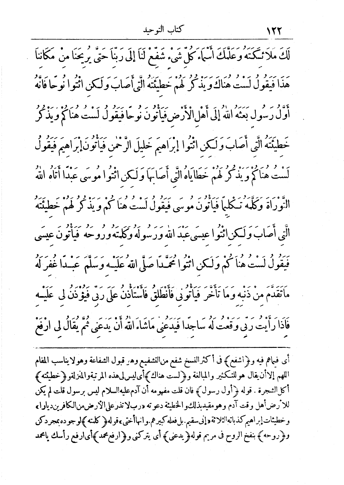 لَكَ مَلَائِكَتَهُ وَعَلَّمَكَ أَسْمَاءَ كُلِّ شَيْءٍ اشْفَعْ لَنَا إِلَى رَبِّنَا حَتَّى يُرِيحَنَا مِنْ مَكَانِنَا هَذَا فَيَقُولُ لَسْتُ هُنَاكَ وَيَذْكُرُ لَهُمْ خَطِيئَتَهُ الَّتِي أَصَابَهَا وَلَكِنْ ائْتُوا نُوحًا فَإِنَّهُ أَوَّلُ رَسُولٍ بَعَثَهُ اللَّهُ إِلَى أَهْلِ الْأَرْضِ فَيَاتُونَ نُوحًا فَيَقُولُ لَسْتُ هُنَاكُمْ وَيَذْكُرُ خَطِيئَتَهُ الَّتِي أَصَابَ وَلَكِنْ ائْتُوا إِبْرَاهِيمَ خَلِيلَ الرَّحْمَنِ فَيَاتُونَ إِبْرَاهِيمَ فَيَقُولُ لَسْتُ هُنَاكُمْ وَيَذْكُرُ لَهُمْ خَطَايَاهُ الَّتِي أَصَابَهَا وَلَكِنْ ائْتُوا مُوسَى عَبْدًا آتَاهُ اللَّهُ التَّوْرَاةَ وَكَلَّمَهُ تَكْلِيمًا فَيَاتُونَ مُوسَى فَيَقُولُ لَسْتُ هُنَاكُمْ وَيَذْكُرُ لَهُمْ خَطِيئَتَهُ الَّتِي أَصَابَ وَلَكِنْ ائْتُوا عِيسَى عَبْدَ اللَّهِ وَرَسُولَهُ وَكَلِمَتَهُ وَرُوحَهُ فَيَاتُونَ عِيسَى فَيَقُولُ لَسْتُ هُنَاكُمْ وَلَكِنْ ائْتُوا مُحَمَّدًا صَلَّى اللَّهُ عَلَيْهِ وَسَلَّمَ عَبْدًا غُفِرَ لَهُ مَا تَقَدَّمَ مِنْ ذَنْبهِ وَمَا تَأَخَّرَ فَيَاتُونِي فَأَنْطَلِقُ فَأَسْتَاذِنُ عَلَى رَبِّي فَيُؤْذَنُ لِي عَلَيْهِ فَإِذَا رَأَيْتُ رَبِّي وَقَعْتُ لَهُ سَاجِدًا فَيَدَعُنِي مَا شَاءَ اللَّهُ أَنْ يَدَعَنِي ثُمَّ يُقَالُ لِي ارْفَعْ