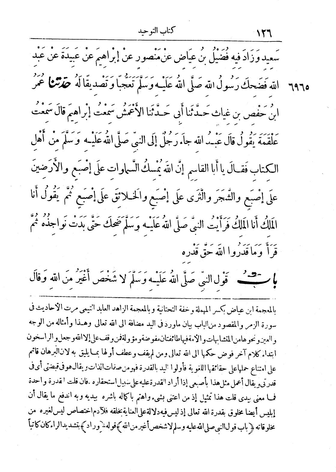 بالمعجمة ابن عياض بكسر المهملة وخفة التحتانية وبالمعجمة الزاهد العابد التيمي مرت الأحاديث في سورة الزمر والمقصود من الباب بيان ما ورد في اليد مضافة إلى الله تعالى وهذا وأمثاله من الوجه والعين ونحوها من المتشابهات والأمة فيها طائفتان مفوضة ومؤولة فمن وقف على إلا الله وجعل والراسخون ابتداء كلام آخر فوض حكمها إلى الله تعالى ومن لم يقف وعطف أولها بما يليق به لأن البرهان قائم على امتناع حملها على حقائقها اللغوية فأولوا اليد بالقدرة فهو من صفات الذات ويقال هو في قبضتي أي في قدرتي ويقال اعمل مثل هذا بأصبعي إذا أراد القدرة عليه على سبيل استحقاره. فإن قلت القدرة واحدة فما معنى بيدي قلت هذا تمثيل إذ من اعتنى بشيء واتهم بإكماله باشره بيديه وبه اندفع ما يقال أن إبليس أيضا مخلوق بقدرة الله تعالى إذ ليس فيه دلالة على العناية بخلقه فلآدم اختصاص ليس لغيره من مخلوقاته، {باب قول النبي صلى الله عليه وسلم لا شخص أغير من الله} قوله {وراد} بتشديد الراء كان كاتباً