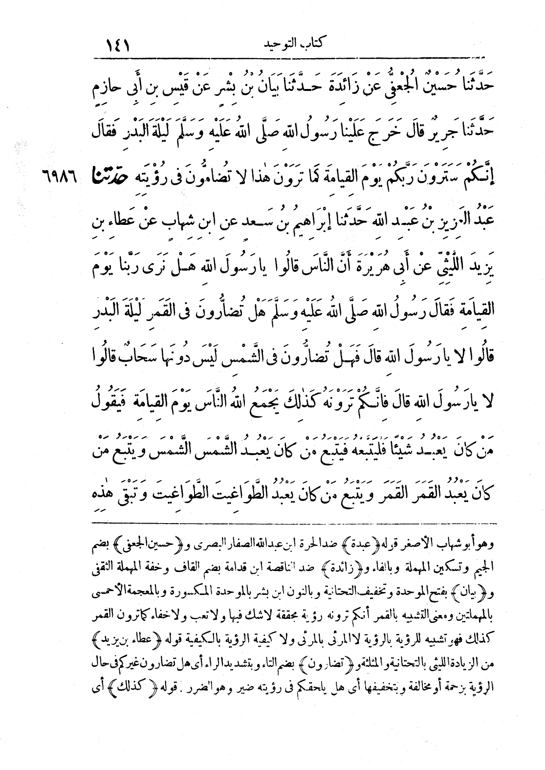 6986 - حَدَّثَنَا عَبْدُ الْعَزِيزِ بْنُ عَبْدِ اللَّهِ حَدَّثَنَا إِبْرَاهِيمُ بْنُ سَعْدٍ عَنْ ابْنِ شِهَابٍ عَنْ عَطَاءِ بْنِ يَزِيدَ اللَّيْثِيِّ عَنْ أَبِي هُرَيْرَةَ أَنَّ النَّاسَ قَالُوا يَا رَسُولَ اللَّهِ هَلْ نَرَى رَبَّنَا يَوْمَ الْقِيَامَةِ فَقَالَ رَسُولُ اللَّهِ صَلَّى اللَّهُ عَلَيْهِ وَسَلَّمَ هَلْ تُضَارُّونَ فِي الْقَمَرِ لَيْلَةَ الْبَدْرِ قَالُوا لَا يَا رَسُولَ اللَّهِ قَالَ فَهَلْ تُضَارُّونَ فِي الشَّمْسِ لَيْسَ دُونَهَا سَحَابٌ قَالُوا لَا يَا رَسُولَ اللَّهِ قَالَ فَإِنَّكُمْ تَرَوْنَهُ كَذَلِكَ يَجْمَعُ اللَّهُ النَّاسَ يَوْمَ الْقِيَامَةِ فَيَقُولُ مَنْ كَانَ يَعْبُدُ شَيْئًا فَلْيَتْبَعْهُ فَيَتْبَعُ مَنْ كَانَ يَعْبُدُ الشَّمْسَ الشَّمْسَ وَيَتْبَعُ مَنْ كَانَ يَعْبُدُ الْقَمَرَ الْقَمَرَ وَيَتْبَعُ مَنْ كَانَ يَعْبُدُ الطَّوَاغِيتَ الطَّوَاغِيتَ وَتَبْقَى هَذِهِ