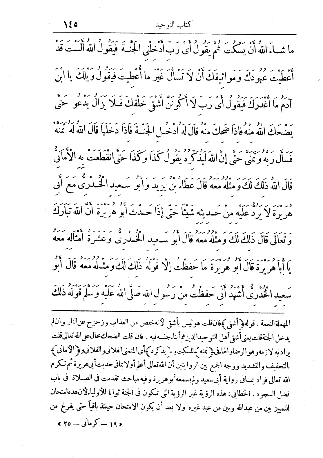 المهملة النعمة، قوله {أشقى} فإن قلت هو ليس بأشقى لأنه خلص من العذاب وزحزح عن النار وإن لم يدخل الجنة قلت يعني أشقى أهل التوحيد الذين هم أبناء جنسه فيه. فإن قلت الضحك محال على الله تعالى قلت يراد به لازمه وهو الرضا والهاء في {تمنه} للسكت و {يذكره} أي المتمنى الفلاني والفلاني و {الأماني} بالتخفيف والتشديد ووجه الجمع بين الروايتين أن الله تعالى أعلم أولا بما في حديث أبي هريرة ثم تكرم الله تعالى فزاد بما في رواية أبي سعيد ولم يسمعه أبو هريرة وفيه مباحث تقدمت في الصلاة في باب فضل السجود، الخطابي: هذه الرؤية غير الرؤية التي تكون في الجنة ثوابا للأولياء لأن هذه امتحان للتمييز بين من عبد الله وبين من عبد غيره ولا بعد أن يكون الامتحان حينئذ باقيا حتى يفرغ من