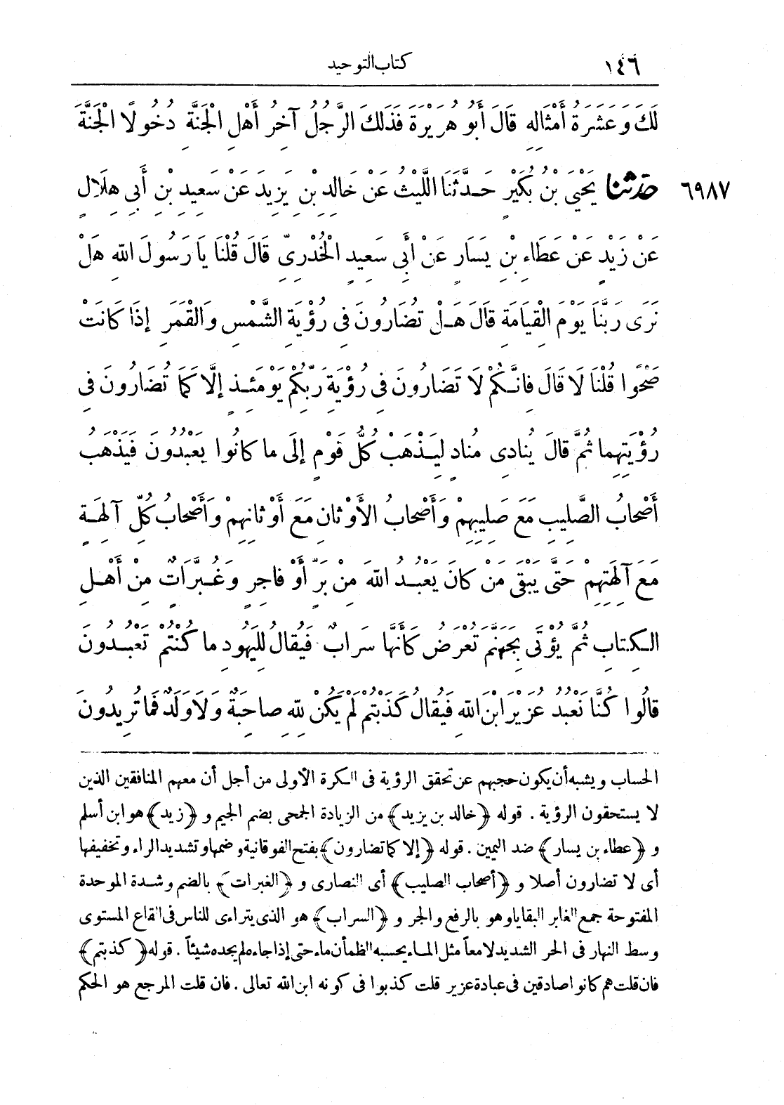 6987 - حَدَّثَنَا يَحْيَى بْنُ بُكَيْرٍ حَدَّثَنَا اللَّيْثُ بْنُ سَعْدٍ عَنْ خَالِدِ بْنِ يَزِيدَ عَنْ سَعِيدِ بْنِ أَبِي هِلَالٍ عَنْ زَيْدٍ عَنْ عَطَاءِ بْنِ يَسَارٍ عَنْ أَبِي سَعِيدٍ الْخُدْرِيِّ قَالَ قُلْنَا يَا رَسُولَ اللَّهِ هَلْ نَرَى رَبَّنَا يَوْمَ الْقِيَامَةِ قَالَ هَلْ تُضَارُونَ فِي رُؤْيَةِ الشَّمْسِ وَالْقَمَرِ إِذَا كَانَتْ صَحْوًا قُلْنَا لَا قَالَ فَإِنَّكُمْ لَا تُضَارُونَ فِي رُؤْيَةِ رَبِّكُمْ يَوْمَئِذٍ إِلَّا كَمَا تُضَارُونَ فِي رُؤْيَتِهِمَا ثُمَّ قَالَ يُنَادِي مُنَادٍ لِيَذْهَبْ كُلُّ قَوْمٍ إِلَى مَا كَانُوا يَعْبُدُونَ فَيَذْهَبُ أَصْحَابُ الصَّلِيبِ مَعَ صَلِيبِهِمْ وَأَصْحَابُ الْأَوْثَانِ مَعَ أَوْثَانِهِمْ وَأَصْحَابُ كُلِّ آلِهَةٍ مَعَ آلِهَتِهِمْ حَتَّى يَبْقَى مَنْ كَانَ يَعْبُدُ اللَّهَ مِنْ بَرٍّ أَوْ فَاجِرٍ وَغُبَّرَاتٌ مِنْ أَهْلِ الْكِتَابِ ثُمَّ يُؤْتَى بِجَهَنَّمَ تُعْرَضُ كَأَنَّهَا سَرَابٌ فَيُقَالُ لِلْيَهُودِ مَا كُنْتُمْ تَعْبُدُونَ قَالُوا كُنَّا نَعْبُدُ عُزَيْرَ ابْنَ اللَّهِ فَيُقَالُ كَذَبْتُمْ لَمْ يَكُنْ لِلَّهِ صَاحِبَةٌ وَلَا وَلَدٌ فَمَا تُرِيدُونَ قَالُوا نُرِيدُ أَنْ تَسْقِيَنَا فَيُقَالُ اشْرَبُوا فَيَتَسَاقَطُونَ فِي جَهَنَّمَ ثُمَّ يُقَالُ لِلنَّصَارَى مَا كُنْتُمْ تَعْبُدُونَ فَيَقُولُونَ كُنَّا نَعْبُدُ الْمَسِيحَ ابْنَ اللَّهِ فَيُقَالُ كَذَبْتُمْ لَمْ يَكُنْ لِلَّهِ صَاحِبَةٌ وَلَا وَلَدٌ فَمَا تُرِيدُونَ