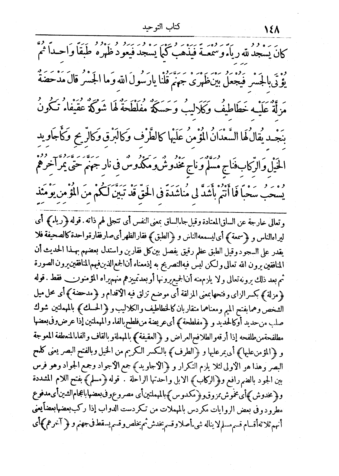 وتعالى خارجة عن الساق المعتادة وقيل جاء الساق المعتادة وقيل جاء الساق بمعنى النفس أي تجلى لهم ذاته، قوله {رياء} أي ليراه الناس و {سمعة} أي ليسمعه الناس و {الطبق} فقار الظهر أي صار فقارة واحدة كالصحيفة فلا يقدر على السجود وقيل الطبق عظم رقيق يفصل بين كل فقارين واستدل بعضهم بهذا الحديث أن المنافقين يرون الله تعالى ولكن ليس فيه التصريح به إذ معناه أن الجمع الذين فيهم المنافقين يرون الصورة ثم بعد ذلك يرونه تعالى ولا يلزم منه أن الجمع يرونها أو بعد تمييزهم منهم يراه المؤمنون فقط. قوله {مزلة} بكسر الزاي وفتحها بمعنى المزلقة أي موضع تزلق فيه الأقدام و {مدحضة} أي محل ميل الشخص وهما بفتح الميم ومعناهما متقاربان كالخطاطيف والكلاليب و {الحسك} بالمهملتين شوك صلب من حديد أو كالحديد و {مفلطحة} أي عريضة من فلطح بالفاء والمهملتين إذا عرض وفي بعضها مفلطحة من طلفحة إذا أرقه والطلافح العراض و {العقيفة} بالمهملة وبالقاف والفاء المنعطفة المعوجة و {المؤمن عليها} أي يمر عليها و {الطرف} بالكسر الكريم من الخيل وبالفتح البصر يعني كلمح البصر وهذا هو الأولى لئلا يلزم التكرار و {الأجاويد} جمع الأجواد وجمع الجواد وهو فرس بين الجود بالضم رافع و {الركاب} البل واحدتها الراحلة. قوله {مسلم} بفتح اللام المشددة و {مخدوش} أي مخموش ممزق و {مكدوس} بالمهملتين أي مصروع وفي بعها بإعجام الشين أي مدفوع مطرود وفي بعض الروايات مكردس بالمهملات من تكردست الدواب إذا ركب بعضها بعضا يعني أنهم ثلاثة أقسام قسم مسلم لا يناله شيء أصلا وقسم يخدش ثم يخلص وقسم يسقط في جهنم و {آخرهم} أي
