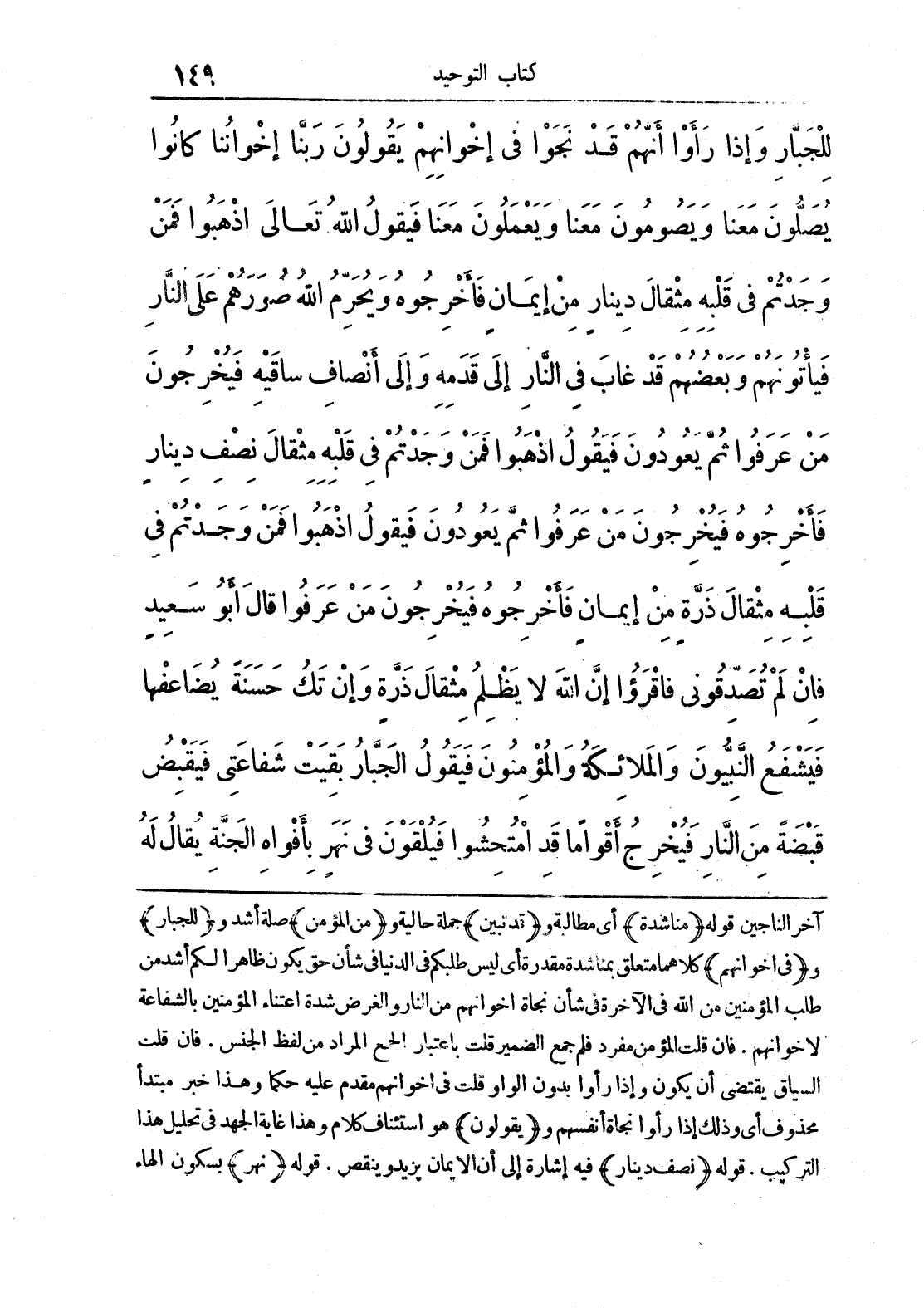 آخر الناجين قوله {مناشدة} أي مطالبة و {قد تبين} جملة حالية و {من المؤمن} صلة أشد و {للجبار} و {في إخوانهم} كلاهما متعلق بمناشدة مقدرة أي ليس طلبكم في الدنيا في شأن حق يكون ظاهرا لكم أشد من طلب المؤمنين من الله في الآخرة في شأن نجاة إخوانهم من النار والغرض شدة اعتناء المؤمنين بالشفاعة لإخوانهم، فإن قلت المؤمن مفرد فلم جمع الضمير قلت باعتبار الجمع المراد من لفظ الجنس. فإن قلت السياق يقتضي أن يكون وإذا رأوا بدون الواو قلت في إخوانهم مقدم عليه حكما وهذا خبر مبتدأ محذوف أي وذلك إذا رأوا نجاة أنفسهم و {يقولون} هو استئناف كلام وهذا غاية الجهد في تحليل هذا التركيب، قوله {نصف دينار} فيه إشارة إلى أن الإيمان يزيد وينقص. قوله {نهر} بسكون الهاء