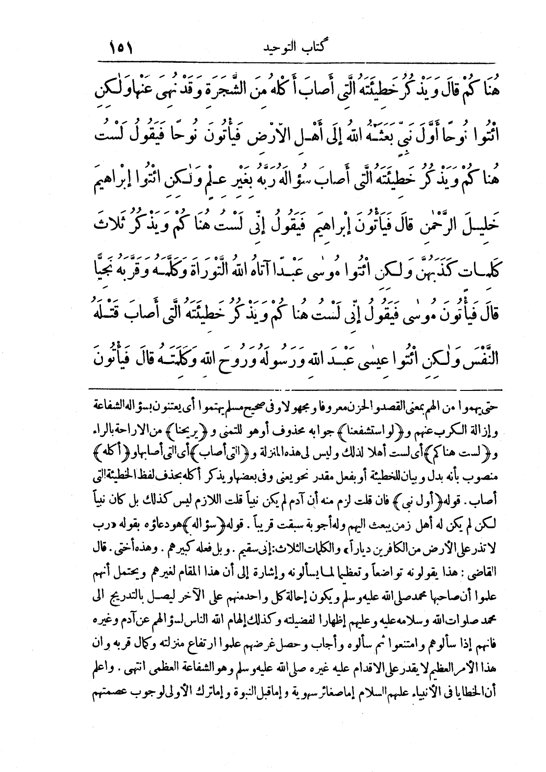 هُنَاكُمْ قَالَ وَيَذْكُرُ خَطِيئَتَهُ الَّتِي أَصَابَ أَكْلَهُ مِنْ الشَّجَرَةِ وَقَدْ نُهِيَ عَنْهَا وَلَكِنْ ائْتُوا نُوحًا أَوَّلَ نَبِيٍّ بَعَثَهُ اللَّهُ إِلَى أَهْلِ الْأَرْضِ فَيَاتُونَ نُوحًا فَيَقُولُ لَسْتُ هُنَاكُمْ وَيَذْكُرُ خَطِيئَتَهُ الَّتِي أَصَابَ سُؤَالَهُ رَبَّهُ بِغَيْرِ عِلْمٍ وَلَكِنْ ائْتُوا إِبْرَاهِيمَ خَلِيلَ الرَّحْمَنِ قَالَ فَيَاتُونَ إِبْرَاهِيمَ فَيَقُولُ إِنِّي لَسْتُ هُنَاكُمْ وَيَذْكُرُ ثَلَاثَ كَلِمَاتٍ كَذَبَهُنَّ وَلَكِنْ ائْتُوا مُوسَى عَبْدًا آتَاهُ اللَّهُ التَّوْرَاةَ وَكَلَّمَهُ وَقَرَّبَهُ نَجِيًّا قَالَ فَيَاتُونَ مُوسَى فَيَقُولُ إِنِّي لَسْتُ هُنَاكُمْ وَيَذْكُرُ خَطِيئَتَهُ الَّتِي أَصَابَ قَتْلَهُ النَّفْسَ وَلَكِنْ ائْتُوا عِيسَى عَبْدَ اللَّهِ وَرَسُولَهُ وَرُوحَ اللَّهِ وَكَلِمَتَهُ قَالَ فَيَاتُونَ