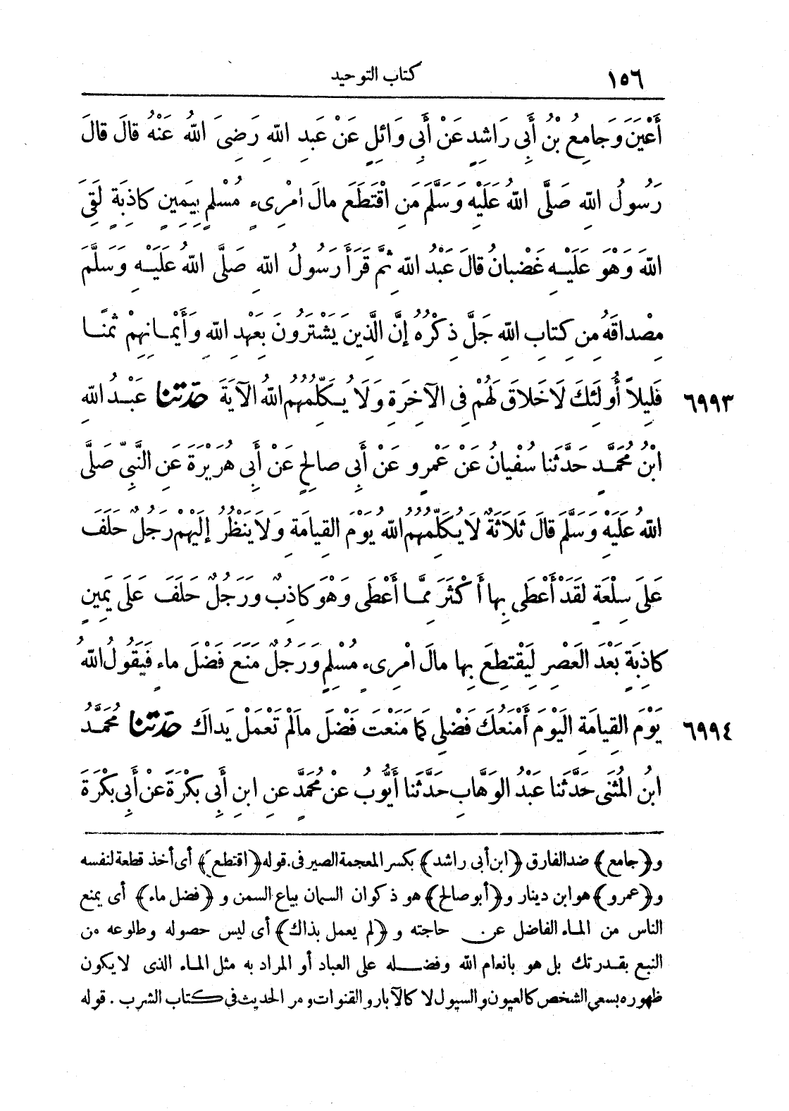 6993 - حَدَّثَنَا عَبْدُ اللَّهِ بْنُ مُحَمَّدٍ حَدَّثَنَا سُفْيَانُ عَنْ عَمْرٍو عَنْ أَبِي صَالِحٍ عَنْ أَبِي هُرَيْرَةَ عَنْ النَّبِيِّ صَلَّى اللَّهُ عَلَيْهِ وَسَلَّمَ قَالَ ثَلَاثَةٌ لَا يُكَلِّمُهُمْ اللَّهُ يَوْمَ الْقِيَامَةِ وَلَا يَنْظُرُ إِلَيْهِمْ رَجُلٌ حَلَفَ عَلَى سِلْعَةٍ لَقَدْ أَعْطَى بِهَا أَكْثَرَ مِمَّا أَعْطَى وَهُوَ كَاذِبٌ وَرَجُلٌ حَلَفَ عَلَى يَمِينٍ كَاذِبَةٍ بَعْدَ الْعَصْرِ لِيَقْتَطِعَ بِهَا مَالَ امْرِئٍ مُسْلِمٍ وَرَجُلٌ مَنَعَ فَضْلَ مَاءٍ فَيَقُولُ اللَّهُ يَوْمَ الْقِيَامَةِ الْيَوْمَ أَمْنَعُكَ فَضْلِي كَمَا مَنَعْتَ فَضْلَ مَا لَمْ تَعْمَلْ يَدَاكَ