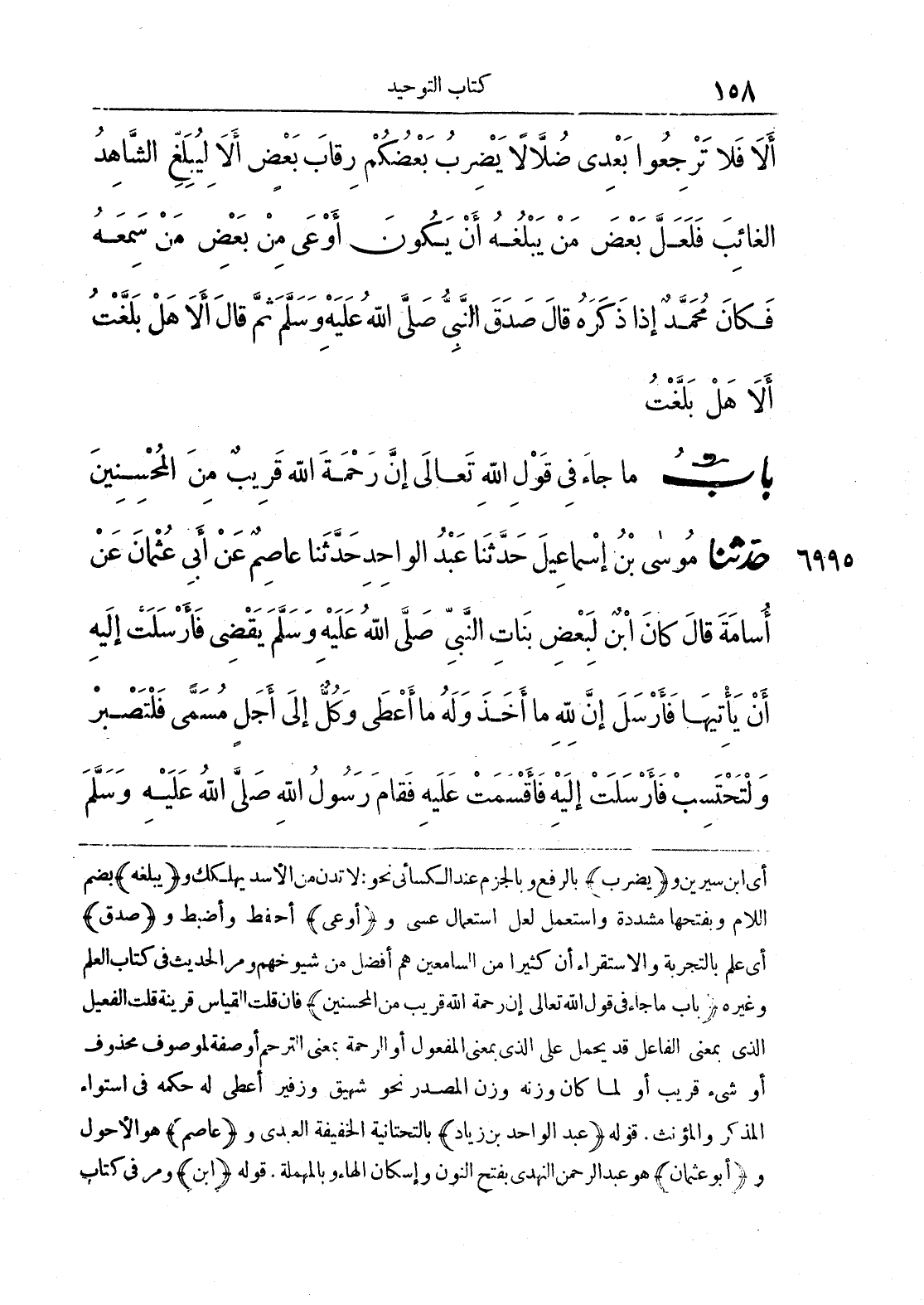 أي ابن سيرين و {يضرب} بالرفع وبالجزم عند الكسائي نحو: لا تدن من الأسد يهلكك و {يبلغه} بضم اللام وبفتحها مشددة واستعمل لعل استعمال عسى و {أوعى} أحفظ وأضبط و {صدق} أي علم بالتجربة والاستقراء أن كثيرا من السامعين هم أفضل من شيوخهم ومر الحديث في كتاب العلم وغيره. {باب ما جاء في قوله تعالى إن رحمة الله قريب من المحسنين} فإن قلت القياس قرينة قلت الفعيل الذيبمعنى الفاعل قد يحمل على الذي بمعنى المفعول أو الرحمة بمعنى الترحم أو صفة لموصوف محذوف أو شيء قريب أو لما كان وزنه وزن المصدر نحو شهيق وزفير أعطى له حكمه في استواء المذكر والمؤنث. قوله {عبد الواحد بن زياد} بالتحتانية الخفيفة العبدي و {عاصم} هو الأحول و {أبو عثمان} هو عبد الرحمن النهدي بفتح النون وإسكان الهاء وبالمهملة. قوله {ابن} ومر في كتاب