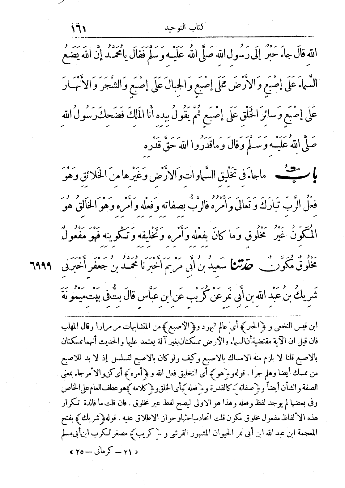 ابن قيس النخعي و {الحبر} أي عالم اليهود و {الأصبع} من المتشابهات مر مرارا وقال المهلب فإن قيل أن الآية مقتضية أن السماء والأرض ممسكتان بغير آلة يعتمد عليها والحديث أنهما ممسكتان بالإصبع وكيف ولو كان بالإصبع لتسلسل إذ لا بد للإصبع من ممسك أيضا وهلم جرا. {باب ما جاء في تخليق السموات والأرض وغيرها من الخلائق} قوله و {هو} أي التخليق فعل الله و {أمره} أي كن والأمر جاء بمعنى الصفة والشأن أيضا و {صفاته} كالقدرة و {فعله} أي الخلق و {كلامه} هو عطف العام على الخاص وفي بعضها لو يوجد لفظ وفعله وهذا هو الأولى ليصح لفظ غير مخلوق فإن قلت ما فائدة تكرار هذه الألفاظ مفعول مخلوق مكون قلت اتحاد مباحثها وجواز الإطلاق عليه. قوله شريك بفتح المعجمة ابن عبد الله ابن أبي نمر الحيوان المشهور القرشي و {كريب} مصغر الكرب ابن أبي مسلم