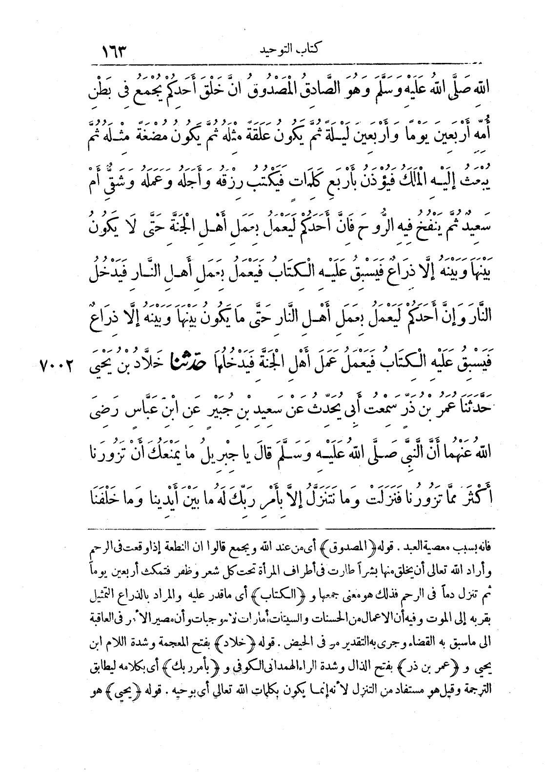 فإنه بسبب معصية العبد. قوله {المصدوق} أي من عند الله ويجمع قالوا إن النطفة إذا وقعت في الرحم وأراد الله تعالى أن يخلق منها بشرا طارت في أطراف المرأة تحت كل شعر وظفر فتمكث أربعين يوما ثم تنزل دما في الرحم فذلك هو معنى جمعها و {الكتاب} أي ما قدر عليه والمراد بالذراع التمثيل بقربه إلى الموت وفيه أن الأعمال من الحسنات والسيئات أمارات لا موجبات وأن مصير الأمر في العاقبة إلى ما سبق به القضاء وجرى به التقدير مر في الحيض. قوله {خلاد} بفتح المعجمة وشدة اللام ابن يحيى و {عمر بن ذر} بفتح الذال وشدة الراء الهمداني الكوفي و {بأمر ربك} أي بكلامه ليطابق الترجمة وقيل هو مستفاد من التنزل لأنه إنما يكون بكلمات الله تعالى أي بوحيه. قوله {يحيى} هو