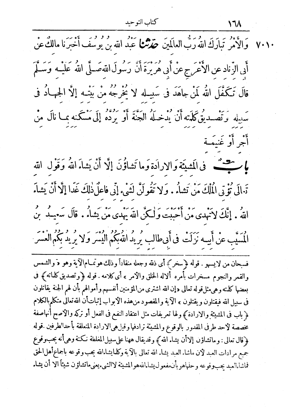 فسبحان من لا يسهو، قوله {سخر} أي ذلّله وجعله منقادا وذلك هو تمام الآية وهو {والشمس والقمر مسخرات بأمره ألا له الخلق والأمر} أي كلامه، قوله {وتصديق كلماته} في بعضها كلمته وهي مثل قوله تعالى {إن الله اشترى من المؤمنين أنفسهم وأمواله بأن لهم الجنة يقاتلون في سبيل الله فيقتلون ويقتلون} الآية والمقصود من هذه الأبواب إثبات أن الله تعالى متكلم بالكلام. {باب في المشيئة والإرادة} ولها تعريفات مثل اعتقاد النفع في الفعل وأو تركه والأصح أنها صفة مخصصة لأحد طرفي المقدور بالوقوع والمشيئة ترادفها وقيل هي الإرادة المتعلقة بأحد الطرفين. قوله {قال تعالى: وما تشاؤون إلا أن يشاء الله} وقد يقال هنا على سبيل المغلطة نكتة وهي أنه يجب وقوع جميع مرادات العبد لأن ما شاء العبد يشاء الله تعالى بالآية وكلما يشاء الله يجب وقوعه بإجماع أهل الحق فما شاء العبد يجب وقوعه وحلها هو بأن مفعول يشاء الله هو المشيئة لا الشيء يعني ما تشاؤون شيئا إلا أن يشاء