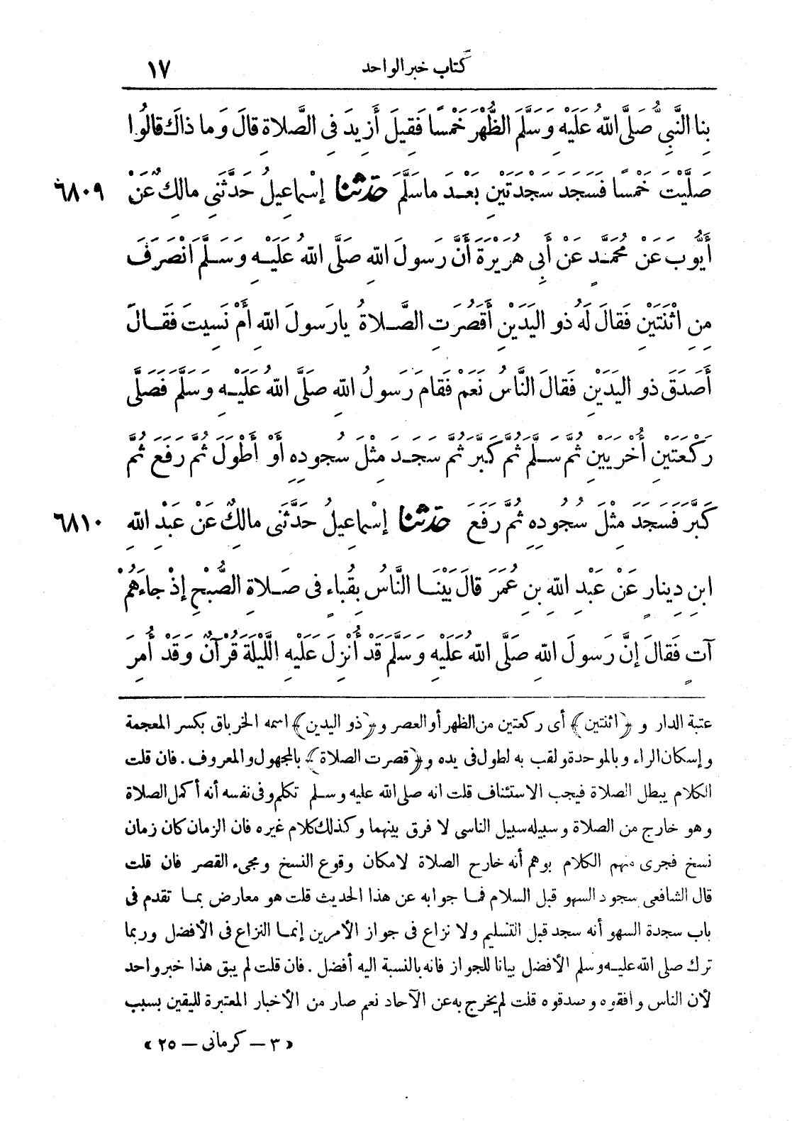 عتبة الدار و {اثنتين} أي ركعتين من الظهر أو العصر و {ذو اليدين} اسمه الخرباق بكسر المعجمة وإسكان الراء وبالموحدة ولقب به لطول في يده و {قصرت الصلاة} بالمجهو المعروف. فإن قلت الكلام يبطل الصلاة فيجب الاستئناف قلت أنه صلى الله عليه وسلم تكلم وفي نفسه أنه أكمل الصلاة وهو خارج من الصلاة وسبيله سبيل الناسي لا فرق بينهما وكذلك كلام غيره فإن الزمان كان زمان نسخ فجرى منه منهم الكلام بوهم أنه خارج الصلاة لا مكان وقوع النسخ ومجيء القصر فإن قلت: قال الشافعي سجود السهو قبل السلام فما جوابه عن هذا الحديث قلت هو معارض بما تقدم في باب سجدة السهو أنه سجد قبل التسليم ولا نزاع في جواز الأمرين إنما النزاع في الأفضل وربما ترك صلى الله عليه وسلم الأفضل بيانا للجواز فإنه بالنسبة إليه أفضل، فإن قلت لم يبق هذا خبر واحد لأن الناس وافقوه وصدقوه قلت لم يخرج به عن الآحاد نعم صار من الأخبار المعتبرة لليقين بسبب