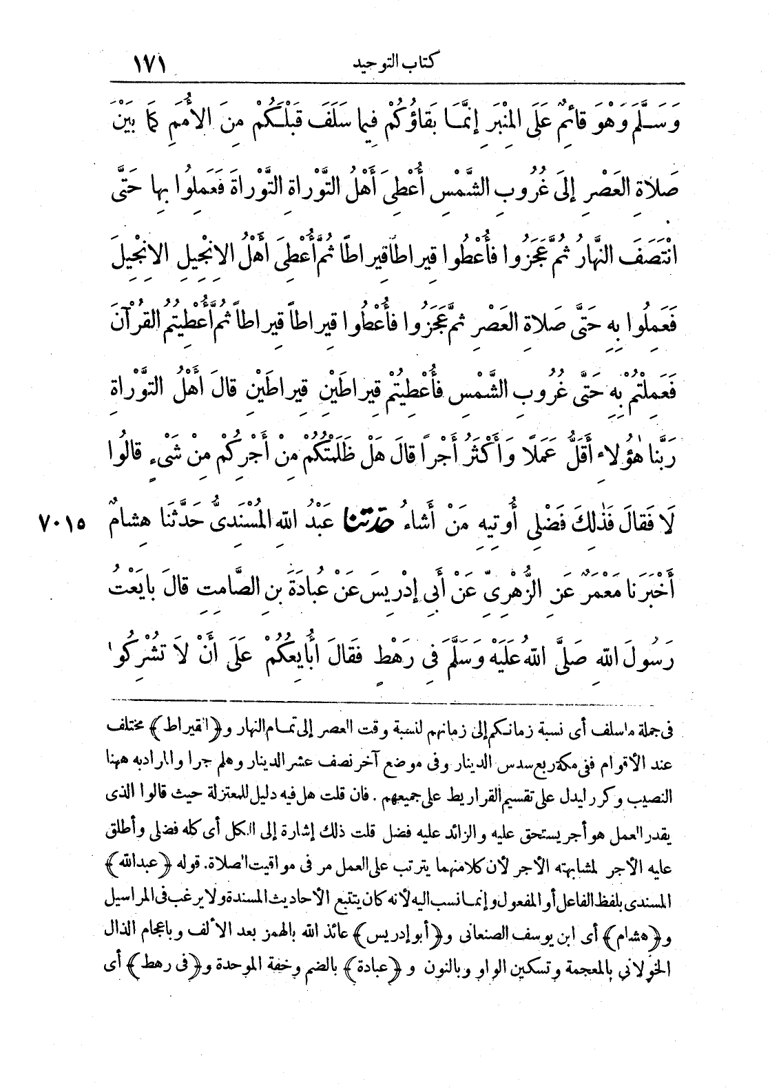7015 - حَدَّثَنَا عَبْدُ اللَّهِ الْمُسْنَدِيُّ حَدَّثَنَا هِشَامٌ أَخْبَرَنَا مَعْمَرٌ عَنْ الزُّهْرِيِّ عَنْ أَبِي إِدْرِيسَ عَنْ عُبَادَةَ بْنِ الصَّامِتِ قَالَ بَايَعْتُ رَسُولَ اللَّهِ صَلَّى اللَّهُ عَلَيْهِ وَسَلَّمَ فِي رَهْطٍ فَقَالَ أُبَايِعُكُمْ عَلَى أَنْ لَا تُشْرِكُوا
