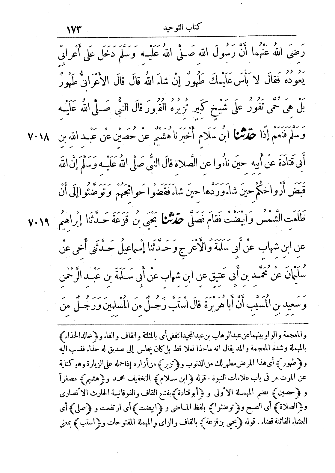والمعجمة والواو بينهما عن عبد الوهاب بن عبد المجيد الثقفي أي بالمثلثة والقاف والفاء و {خالد الحذاء} بالمهملة وشدة المعجمة والمد يقال أنه ما حذا نعلا قط بل كان يجلس إلى صديق له حذاء فنسب إليه و {طهور} أي هذا المرض مطهر لك من الذنوب و {تزير} من أزاره أي حمله على الزيارة وهو كناية عن الموت مر في باب علامات النبوة. قوله {ابن سلام} بالتخفيف محمد و {هشيم} مصغرا و {حصين} بضم المهملة الأولى و {أبو قتادة} بفتح القاف والفوقانية الحارث الأنصاري و {الصلاة} أي الصبح و {توضئوا} بلفظ الماضي و {ابيضت} أي ارتفعت و {صلى} أي العشاء الفائتة قضاء. قوله {قوله} يحيى بن قزعة بالقاف والزاي والمهملة المفتوحات و {استب} بمعنى