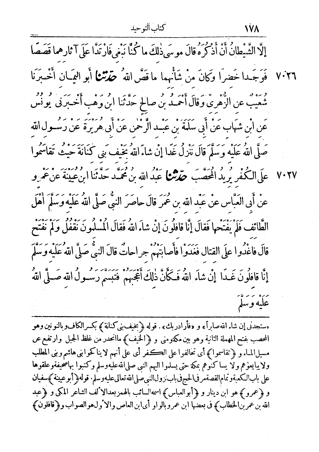 7026 - حَدَّثَنَا أَبُو الْيَمَانِ أَخْبَرَنَا شُعَيْبٌ عَنْ الزُّهْرِيِّ وَقَالَ أَحْمَدُ بْنُ صَالِحٍ حَدَّثَنَا ابْنُ وَهْبٍ أَخْبَرَنِي يُونُسُ عَنْ ابْنِ شِهَابٍ عَنْ أَبِي سَلَمَةَ بْنِ عَبْدِ الرَّحْمَنِ عَنْ أَبِي هُرَيْرَةَ عَنْ رَسُولِ اللَّهِ صَلَّى اللَّهُ عَلَيْهِ وَسَلَّمَ قَالَ نَنْزِلُ غَدًا إِنْ شَاءَ اللَّهُ بِخَيْفِ بَنِي كِنَانَةَ حَيْثُ تَقَاسَمُوا عَلَى الْكُفْرِ يُرِيدُ الْمُحَصَّبَ