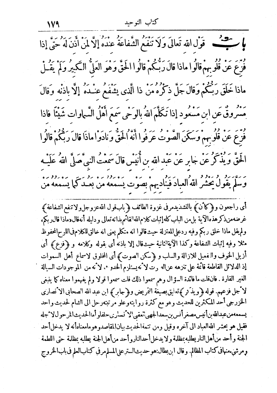 وَلَمْ يَقُلْ مَاذَا خَلَقَ رَبُّكُمْ وَقَالَ جَلَّ ذِكْرُهُ {مَنْ ذَا الَّذِي يَشْفَعُ عِنْدَهُ إِلَّا بِإِذْنِهِ} وَقَالَ مَسْرُوقٌ عَنْ ابْنِ مَسْعُودٍ إِذَا تَكَلَّمَ اللَّهُ بِالْوَحْيِ سَمِعَ أَهْلُ السَّمَوَاتِ شَيْئًا فَإِذَا فُزِّعَ عَنْ قُلُوبِهِمْ وَسَكَنَ الصَّوْتُ عَرَفُوا أَنَّهُ الْحَقُّ وَنَادَوْا {مَاذَا قَالَ رَبُّكُمْ قَالُوا الْحَقَّ} وَيُذْكَرُ عَنْ جَابِرٍ عَنْ عَبْدِ اللَّهِ بْنِ أُنَيْسٍ قَالَ سَمِعْتُ النَّبِيَّ صَلَّى اللَّهُ عَلَيْهِ وَسَلَّمَ يَقُولُ يَحْشُرُ اللَّهُ الْعِبَادَ فَيُنَادِيهِمْ بِصَوْتٍ يَسْمَعُهُ مَنْ بَعُدَ كَمَا يَسْمَعُهُ مَنْ