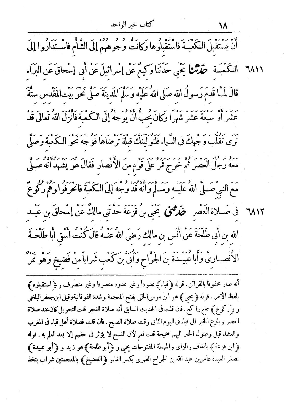 6811 - حَدَّثَنَا يَحْيَى حَدَّثَنَا وَكِيعٌ عَنْ إِسْرَائِيلَ عَنْ أَبِي إِسْحَاقَ عَنْ الْبَرَاءِ قَالَ لَمَّا قَدِمَ رَسُولُ اللَّهِ صَلَّى اللَّهُ عَلَيْهِ وَسَلَّمَ الْمَدِينَةَ صَلَّى نَحْوَ بَيْتِ الْمَقْدِسِ سِتَّةَ عَشَرَ أَوْ سَبْعَةَ عَشَرَ شَهْرًا وَكَانَ يُحِبُّ أَنْ يُوَجَّهَ إِلَى الْكَعْبَةِ فَأَنْزَلَ اللَّهُ تَعَالَى {قَدْ نَرَى تَقَلُّبَ وَجْهِكَ فِي السَّمَاءِ فَلَنُوَلِّيَنَّكَ قِبْلَةً تَرْضَاهَا} فَوُجِّهَ نَحْوَ الْكَعْبَةِ وَصَلَّى مَعَهُ رَجُلٌ الْعَصْرَ ثُمَّ خَرَجَ فَمَرَّ عَلَى قَوْمٍ مِنْ الْأَنْصَارِ فَقَالَ هُوَ يَشْهَدُ أَنَّهُ صَلَّى مَعَ النَّبِيِّ صَلَّى اللَّهُ عَلَيْهِ وَسَلَّمَ وَأَنَّهُ قَدْ وُجِّهَ إِلَى الْكَعْبَةِ فَانْحَرَفُوا وَهُمْ رُكُوعٌ فِي صَلَاةِ الْعَصْرِ