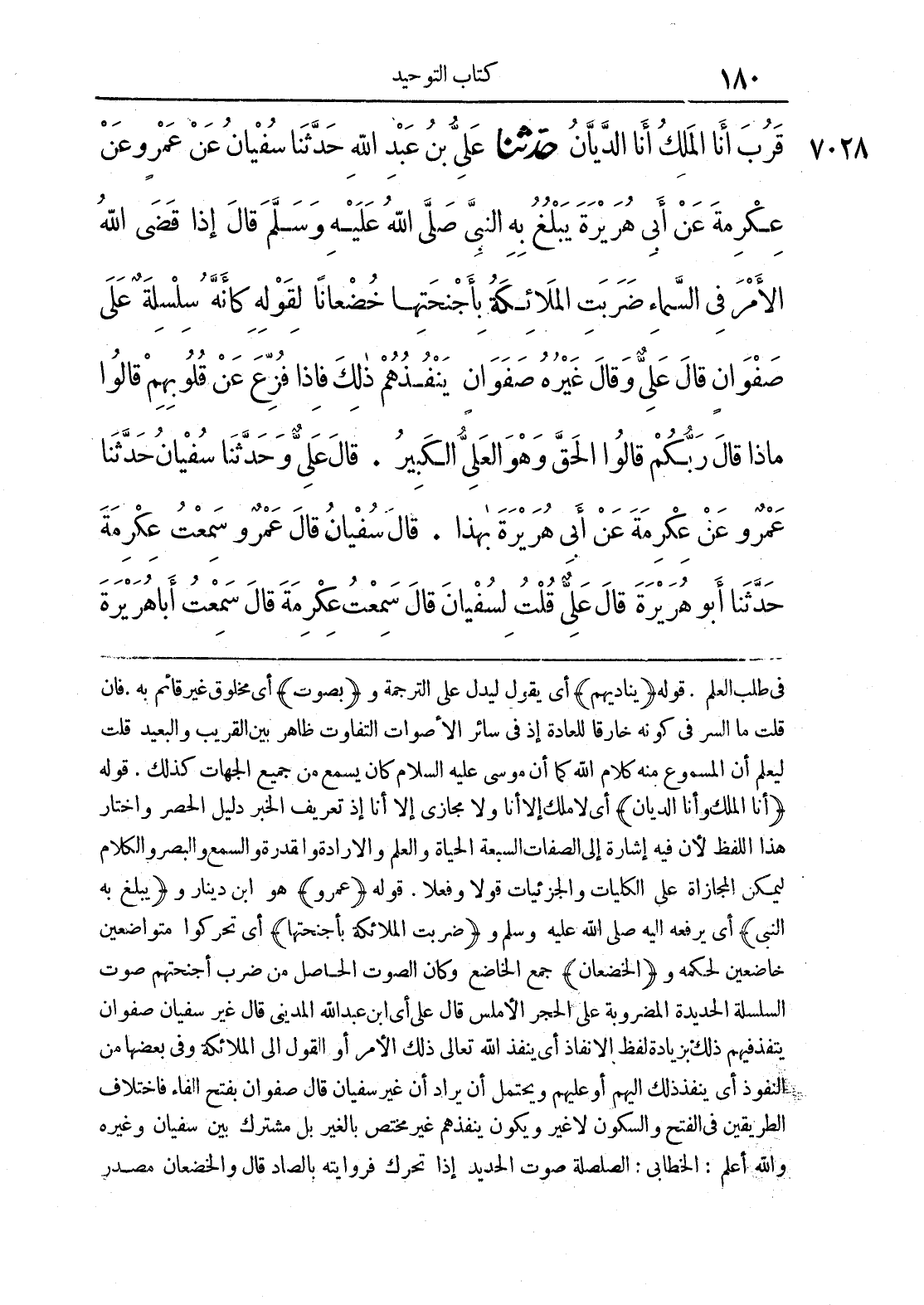 7028 - حَدَّثَنَا عَلِيُّ بْنُ عَبْدِ اللَّهِ حَدَّثَنَا سُفْيَانُ عَنْ عَمْرٍو عَنْ عِكْرِمَةَ عَنْ أَبِي هُرَيْرَةَ يَبْلُغُ بِهِ النَّبِيَّ صَلَّى اللَّهُ عَلَيْهِ وَسَلَّمَ قَالَ إِذَا قَضَى اللَّهُ الْأَمْرَ فِي السَّمَاءِ ضَرَبَتْ الْمَلَائِكَةُ بِأَجْنِحَتِهَا خُضْعَانًا لِقَوْلِهِ كَأَنَّهُ سِلْسِلَةٌ عَلَى صَفْوَانٍ قَالَ عَلِيٌّ وَقَالَ غَيْرُهُ صَفْوَانٍ يَنْفُذُهُمْ ذَلِكَ فَإِذَا {فُزِّعَ عَنْ قُلُوبِهِمْ قَالُوا مَاذَا قَالَ رَبُّكُمْ قَالُوا الْحَقَّ وَهُوَ الْعَلِيُّ الْكَبِيرُ} قَالَ عَلِيٌّ وَحَدَّثَنَا سُفْيَانُ حَدَّثَنَا عَمْرٌو عَنْ عِكْرِمَةَ عَنْ أَبِي هُرَيْرَةَ بِهَذَا. قَالَ سُفْيَانُ قَالَ عَمْرٌو سَمِعْتُ عِكْرِمَةَ حَدَّثَنَا أَبُو هُرَيْرَةَ قَالَ عَلِيٌّ قُلْتُ لِسُفْيَانَ قَالَ سَمِعْتُ عِكْرِمَةَ قَالَ سَمِعْتُ أَبَا هُرَيْرَةَ