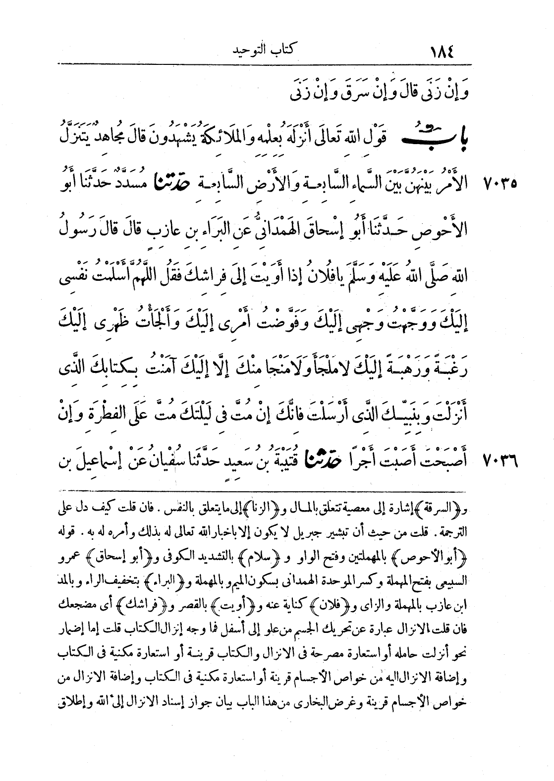 و {السرقة} إشارة إلى معصية تتعلق بالمال و {الزنا} إلى ما يتعلق بالنفس. فإن قلت كيف دل على الترجمة. قلت من حيث تبشير جبريل لا يكون إلا بإخبار الله تعالى له بذلك وأمره له به، {باب قوله تعالى أنزله بعلمه والملائكة يشهدون} قوله {أبو الأحوص} بالمهملتين وفتح الواو و {سلام} بالتشديد الكوفي و {أبو إسحاق} عمرو السبيعي بفتح المهملة وكسر الموحدة الهمداني بسكون الميم وبالمهملة و {البراء} بتخفيف الراء وبالمد ابن عازب بالمهملة والزاي و {فلان} كناية عنه و {أويت} بالقصر و {فراشك} أي مضجعك فإن قلت الإنزال عبارة عن تحريك الجسم من علو إلى أسفل فما وجه إنزال الكتاب قلت إما إضمار نحو أنزلت حامله أو استعارة مصرحة في الإنزال والكتاب قرينة أو استعارة مكنية في الكتاب وإضافة الإنزال إليه من خواص الأجسام قرينة أو استعارة مكنية في الكتاب وإضافة الإنزال من خواص الأجسام قرينة وغرض البخاري من هذا الباب بيان جواز إسناد الإنزال إلى الله وإطلاق