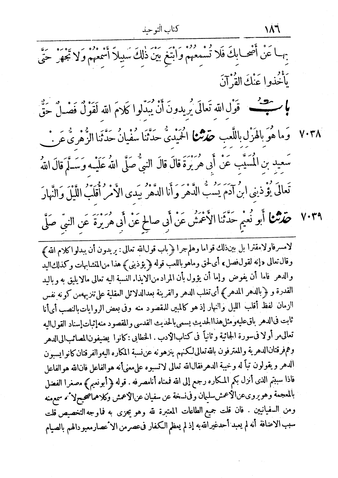 7038 - حَدَّثَنَا الْحُمَيْدِيُّ حَدَّثَنَا سُفْيَانُ حَدَّثَنَا الزُّهْرِيُّ عَنْ سَعِيدِ بْنِ الْمُسَيَّبِ عَنْ أَبِي هُرَيْرَةَ قَالَ قَالَ النَّبِيُّ صَلَّى اللَّهُ عَلَيْهِ وَسَلَّمَ قَالَ اللَّهُ تَعَالَى يُؤْذِينِي ابْنُ آدَمَ يَسُبُّ الدَّهْرَ وَأَنَا الدَّهْرُ بِيَدِي الْأَمْرُ أُقَلِّبُ اللَّيْلَ وَالنَّهَارَ